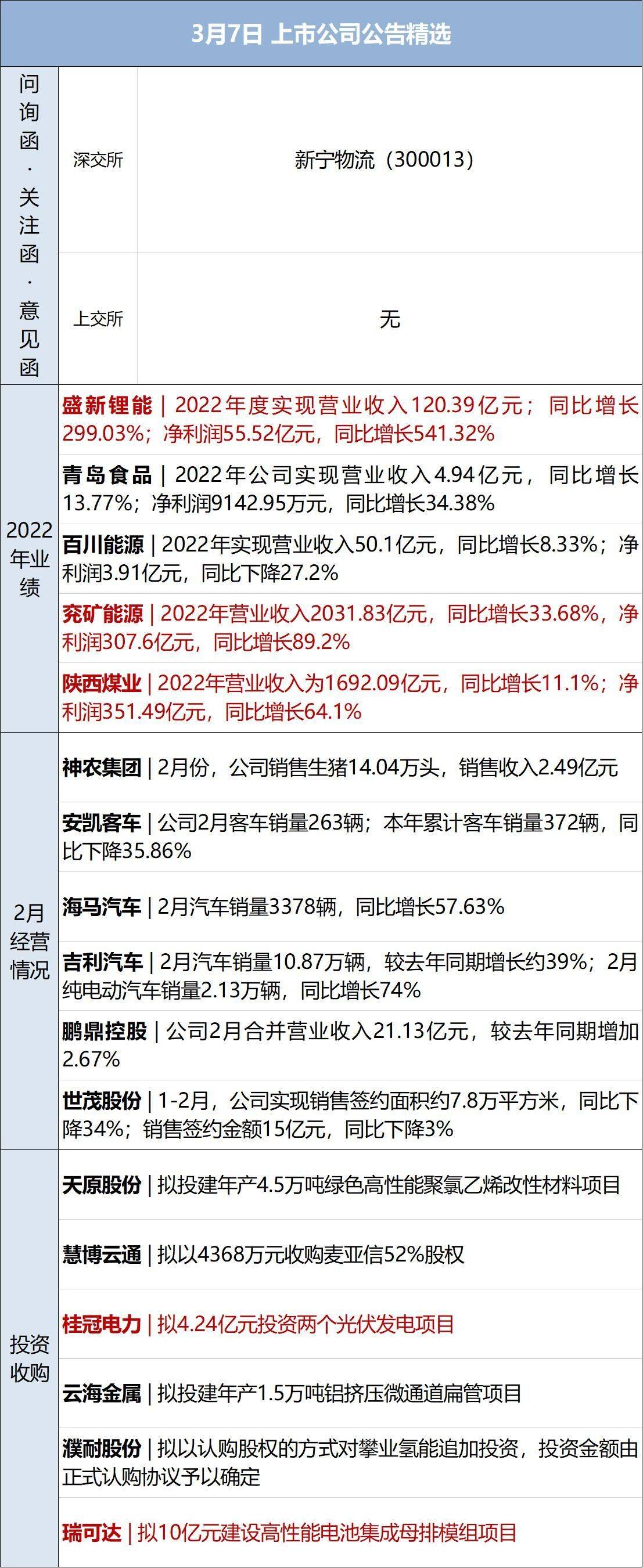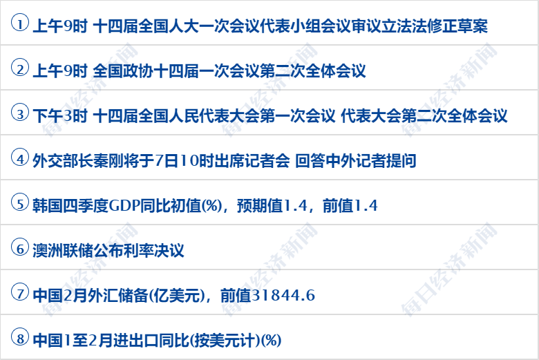 NO.1中共中央总书记、国度主席、中央军委主席习近平6日下午探望了参与全国政协十四届一次会议的民建、工商联界委员,并参与联组会,听取意见和倡议。他强调,党中央一直坚持“两个毫不动摇”“三个没有变”,一直把民营企业和民营企业家当作自己人。要引导民营企业和民营企业家正确了解党中央方针政策,增强自信心、轻装上阵、大胆展开,完成民营经济健康展开、高质量展开。(央视新闻) NO.2关注两会 十四届全国人大一次会议解放军和武警部队代表团新闻发言人谭克非6日就今年中国国防费预算布置的有关状况答记者问。谭克非说,中国坚持走战争展开道路,奉行防御性国防政策,积极参与分离国军费透明制度,从2008年起每年向分离国提交上一财政年度军事开支讲演。与美国等军事大国相比,中国的国防支出不论是占国内消费总值(GDP)的比重、占国度财政支出的比重,还是国民人均国防支出、军人人均国防支出等都是比较低的。中国有限的国防支出完整是为了维护国度主权、保险、展开利益。(新华社) 今年全国两会,全国人大代表、海马集团董事长景柱将盘绕管理“恶追”金融不良债权行为提出倡议:“金融不良债权处置工作事关国度金融保险,触及严重经济利益,影响社会稳定,应当从立法立规层面中止规制,防备‘恶追’金融不良债权行为。”(上证报) 全国政协委员吴尊友在被问到“这三年的头发这个白跟压力大有没有关系”时表示,应该说很多人付出比我多,他们在一线工作,有些人还付出了生命的代价,所以我的这些投入真的算不了什么,很多人头发比我白得多,我只是经过媒体的宣传,似乎感遭到我的工作阅历。实践上更多人接受比我的压力更大,他们比我更辛劳,而且付出得更多,贡献得更多。对“外界一些质疑”问题,吴尊友表示,作为专业人员,有的时分你得有这样一个胆识或者魄力去做这样决议,这样研判,这样能够把正确的信息及时通知老庶民。(央视新闻) 关于8小时工作制,全国人大代表、格力电器董事长兼总裁董明珠日前在接受采访时回应,从维护员工的角度看,假如一天6小时就能处置问题,6小时工作制也能够,但是在这个过程中最大的问题是法定节假日,没有让企业有空间来支配休假时间。因而,董明珠倡议允许企业弹性布置法定节假日。(央广网) 3月6日,娃哈哈集团董事长宗庆后向《每日经济新闻》记者表示,今年政府工作讲演的预期目的包含国内消费总值增长5%左右,这一目的传送了自信心、稳定了预期。讲演提出要着力扩展国内需求,把恢复和扩展消费摆在优先位置,这关于消费企业无疑是一剂有效的“强心针”。 NO.3市场音讯 美股三大指数收盘涨跌不一,道指涨0.12%,标普500指数涨0.07%,纳指跌0.11%。大型科技股涨跌不一,苹果、谷歌涨超1%,微软小幅上涨;特斯拉跌超2%,亚马逊跌逾1%。中概股普跌,纳斯达克中国金龙指数跌1.66%。微博、哔哩哔哩跌超4%,唯品会、蔚来、百度、小鹏汽车、拼多多跌超2%,京东、网易小幅上涨。 国际原油期货结算价小幅上涨。WTI 4月原油期货收涨0.78美圆,涨幅0.98%,报80.46美圆/桶。布伦特5月原油期货收涨0.35美圆,涨幅0.41%,报86.18美圆/桶。NYMEX 4月自然气期货结算价收跌14.52%,报2.5720美圆/百万英热单位。 欧洲主要股指收盘涨跌不一,德国DAX30指数涨0.49%,英国富时100指数跌0.26%,法国CAC40指数涨0.34%,欧洲斯托克50指数涨0.46%。 NO.43月6日上午10时,国新办举行“权威部门话开局”系列主题新闻发布会,引见“着力推进高质量展开,为全面树立社会主义现代化国度开好局起好步”有关状况。有记者提问,中国去年经济增速3%,美国经济增速2.1%,但美国的增量要比中国增量大,中美经济总量差距在扩展,请问如何看待这样一个变更?国度展开变革委副主任赵辰昕表示,美国的高通胀大幅拉高了名义GDP范围,GDP总量比较,还要将以人民币计价的中国GDP范围折算成美圆计价,汇率在其中也会产生重要影响。当前中国经济运转整体向好,近期不少国际机构纷繁上调对中国经济增长的预期。(中国网) NO.5中国外交部6日举行例行记者会。会后有记者问及:韩国外长朴振6日正式发布日本二战强征劳工赔偿计划。中方对此有何评论?发言人毛宁表示,强征和奴役劳工是日本军国主义在对外侵略和殖民统治期间对包含中国、韩国等在内的亚洲国度人民犯下的严重人道主义罪行。这一历史事实铁证如山,不容承认和窜改。中方历来请求日本政府以诚实和担任任的态度妥善处置有关历史遗留问题。这就需求日方真实正视和深化反省历史,以实践行动表示对历史罪行的忏悔和对受害者的尊重,同时以正确史观教育下一代。只需这样,日本才干真正取信于亚洲邻国和国际社会。(央视新闻) NO.63月6日,中共浙江省委宣传部官方微信号“浙江宣传”发布《别让“污名化”行动干扰民营经济》一文。文章称,国务院总理李克强在政府工作讲演中指出,“真实落实‘两个毫不动摇’”。但是近几年,还是有人总是拿民营经济做文章,一有“风吹草动”,“离场论”“国进民退”“以人民经济取代市场经济”等各色论调就甚嚣尘上,动辄“阴谋”“大棋”,唯恐天下不乱。事实证明,民营经济就是那只能抓老鼠的“好猫”。做低民营经济预期,背地是阻滞中国经济展开和科技进步的希图。 NO.7去年11月,中央网信办印发《关于真实增强网络暴力管理的通知》,请求网