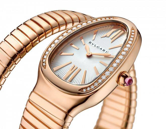 Serpenti Tubogas腕表巧妙融合漂亮气息和现代风范,陪她邂逅曼妙旅程。腕表兼具BVLGARI宝格丽两大标记性的设计元素,将蛇的蜿蜒外型与TUBOGAS金属软管的现代气息交错在一同,寓意着女性的曼妙曲线和灵蛇的灵动身姿。