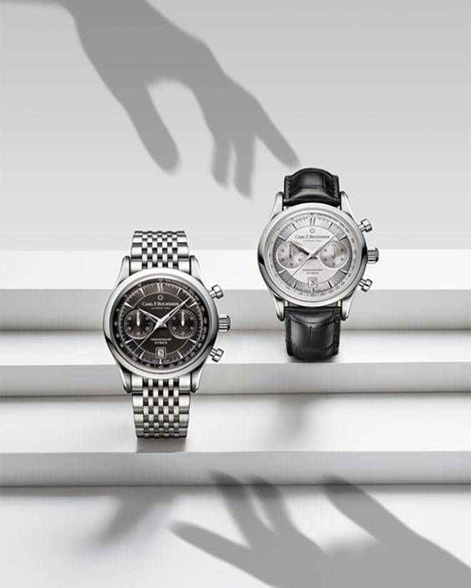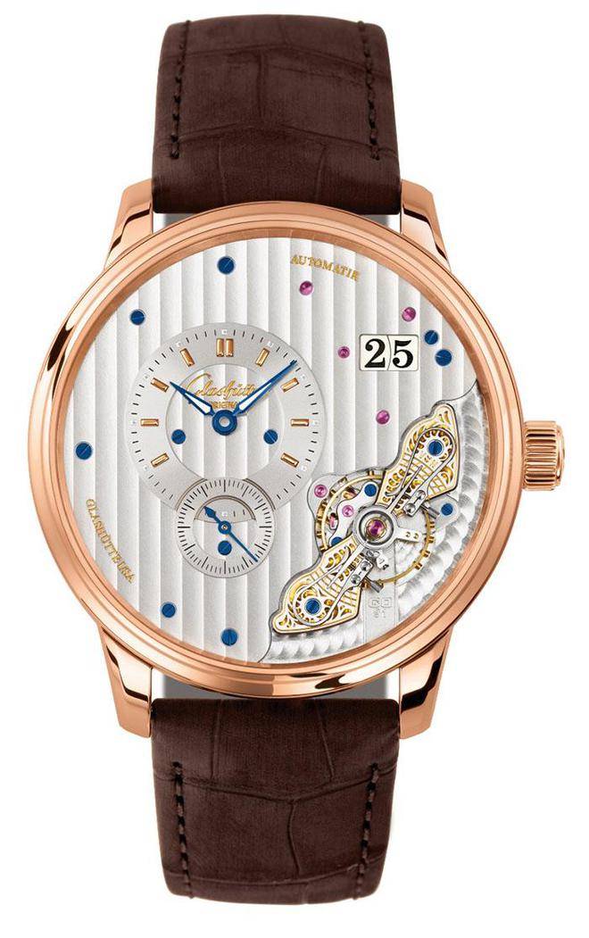 Sixties六零年代腕表以18K玫瑰金表圈配以精密磨砂镀银表盘,轻轻弧曲并配有超级夜光涂料的红金时分针,跟文雅的秒针缓缓转动,确保腕表所显现的时间永远不差毫厘。Seventies Chronograph Panorama Date七零年代大日历计时腕表则秉承德式经典设计情怀及精髓,精钢打造的表壳采用拉丝与抛光处置,精致而美观。