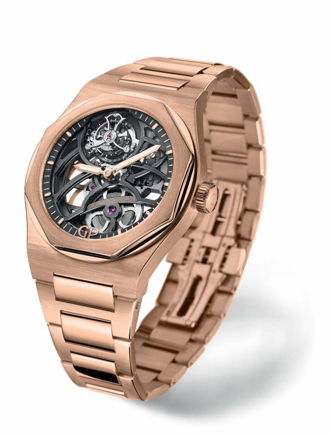 桂冠系列镂空飞行陀飞轮腕表的表壳与链带均以18K玫瑰金材质打造,承袭桂冠系列标记性八角形表圈设计,缎面与抛光修饰交替,带来丰厚层次感的同时使整体设计自然流利。