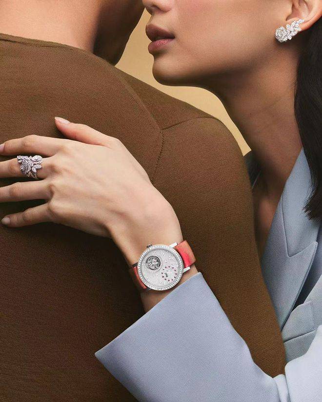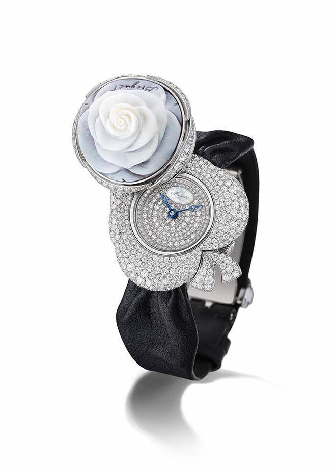 玫瑰花瓣经过精雕细琢,显得活灵活现。悄然按下贝壳浮雕玫瑰,便可轻松读时。18K白色金蝴蝶结铺镶的431颗明亮式切割钻石,表圈上镶嵌的48颗钻石以及表盘上镶嵌的116颗钻石,更是将腕表装点得格外绚烂娇艳,闪烁着灼灼光华,诠释浪漫风情。