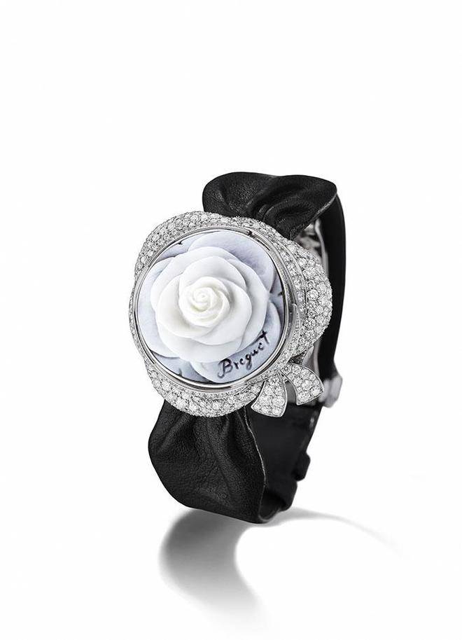 宝玑献上浪漫玫珍宝玑High Jewellery高级珠宝腕表系列Secret de la Reine腕表,以1783年女画家Elisabeth Vigée-Le Brun为法国王后玛丽·安托瓦内特王后创作的《Marie-Antoinette à la rose 》(王后与玫瑰)画作中著名的玫瑰为灵感,以贝壳浮雕的方式将其浪漫中止唯美演绎。