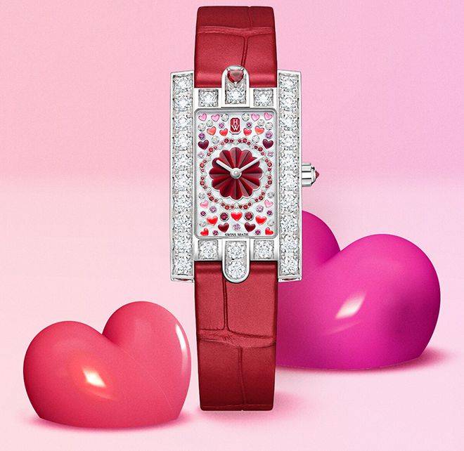 白色珍珠母贝表盘中央突出的三维平面图案上镶嵌有红色珍珠母贝,另名义盘上还饰有粉色和红色蛋面切工心形珍珠母贝、粉色蓝宝石、红宝石,12点钟位置的标记性祖母绿型品牌标识也以扣题的红颜色呈现。