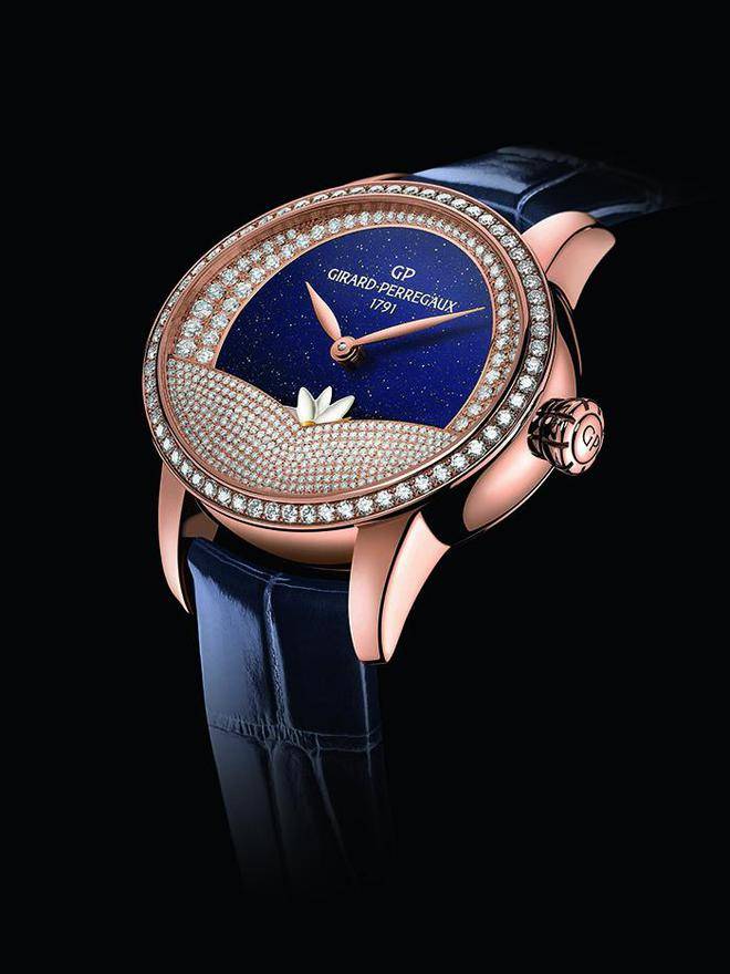 猫眼系列Arabian Jasmin腕表,日/夜指示功用以意味夜色的花朵与意味白天的太阳交替呈现,展示了阿拉伯茉莉在夜幕来临之际纵情绽放的漂亮风姿;猫眼系列永世腕表,深邃的玑镂太阳放射纹,于蓝色半透明珐琅下若隐若现,好像恋人世缠绵的爱意。
