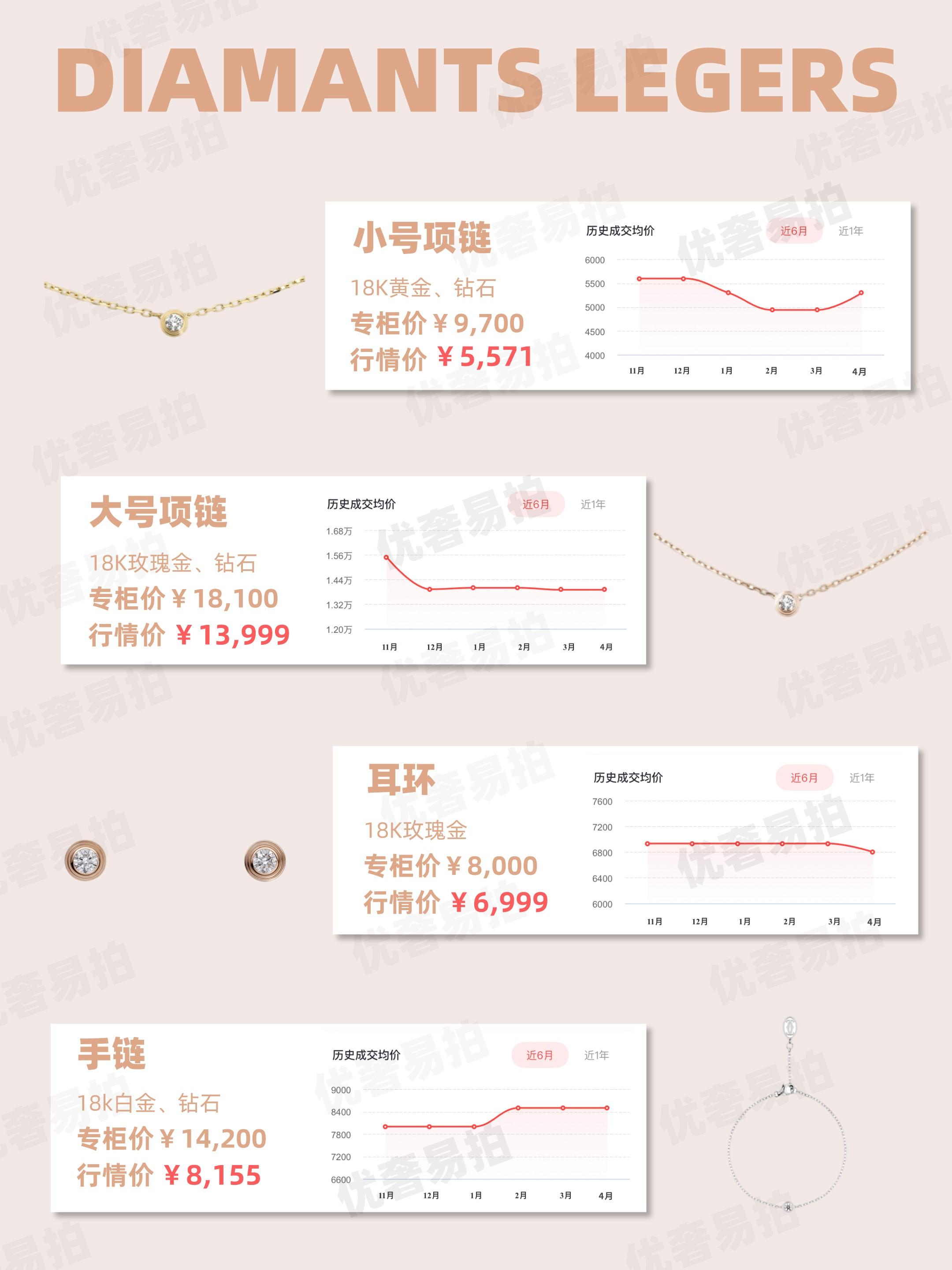 二手朴素品买卖 DIAMANTS LEGERS系列 将简约和漂亮相分离,设计简单大方,很合适作为日常搭配。近期的行情也十分稳定,喜欢的抓紧入手哦~