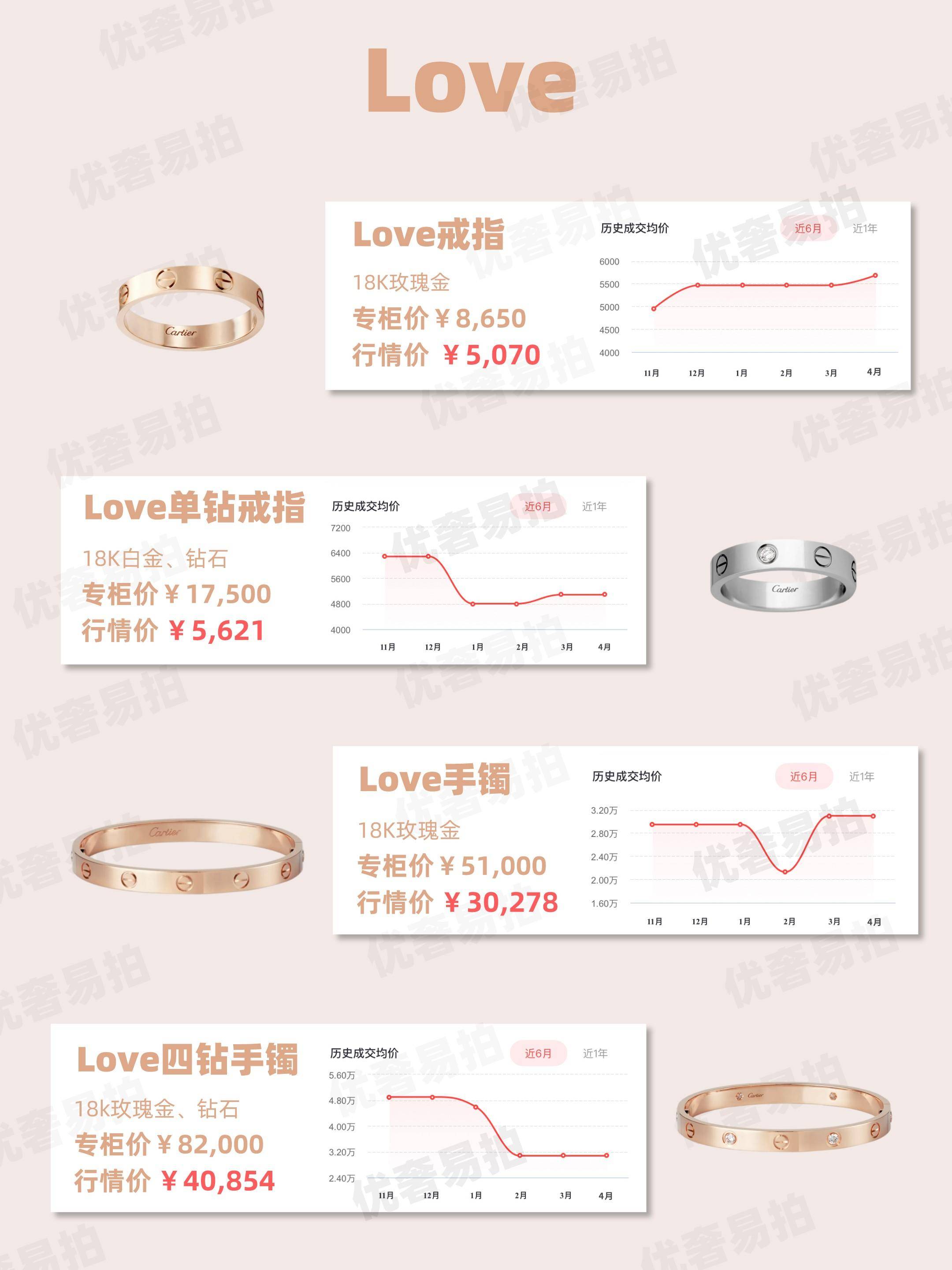 二手朴素品买卖 Love系列 以标记的螺钉设计、精巧的椭圆外形和鲜明的文雅作风,意味着对恋情的忠贞与承诺。极具辨识度,但保值度普通,喜欢的能够去二级市场看看。