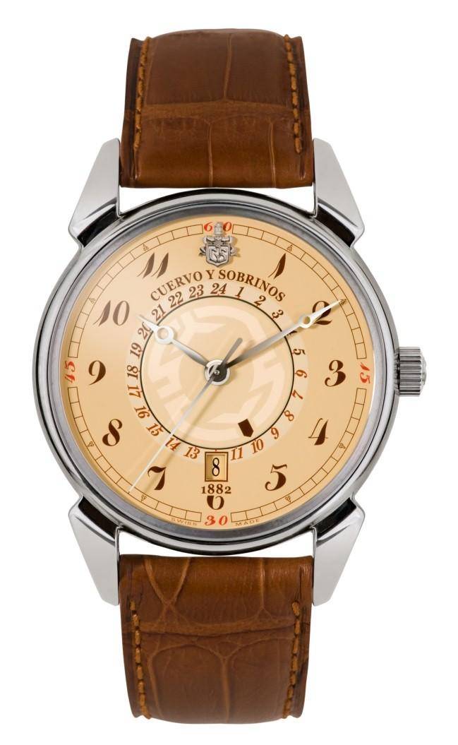 库尔沃-历史学家- 3196.1C机械男表 细看这枚CUERVO Y SOBRINOS库尔沃 3196.1C腕表,即便再低调的颜色,表盘依然沿用热情豪迈的罗马数字刻度与神韵十足的雪茄色搭配,以宝玑指针标记时光活动,复古的日历显现带出成熟稳健的学者风范,GMT格林尼治时间,让你无碍于时区的左右,搭配短吻鳄鱼皮皮带,尤显睿智尊贵。库尔沃将精深腕表工艺,与艺术生活品位圆满融合,这正是历史学家所包含的文人聪慧,市场价28000元。