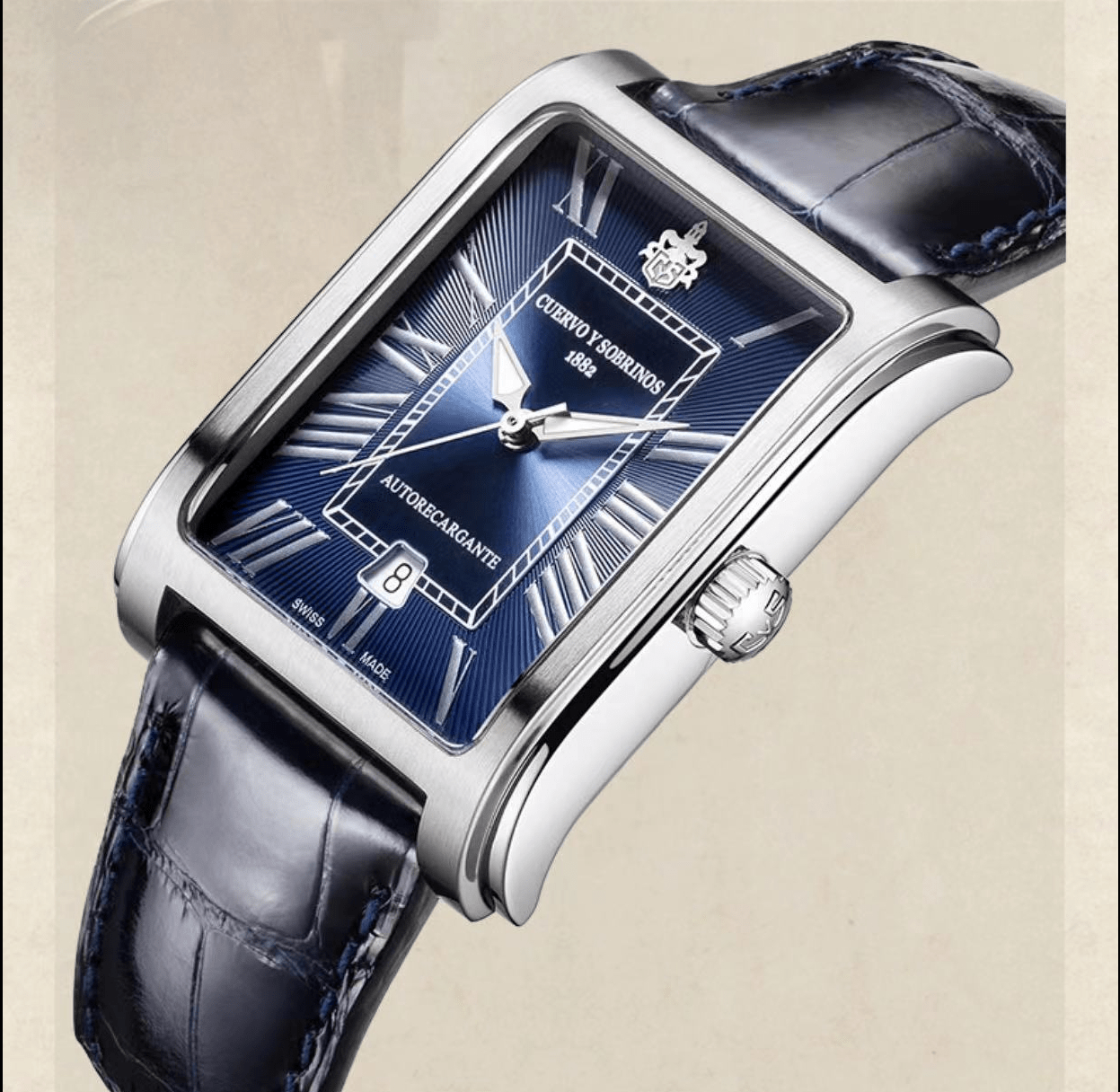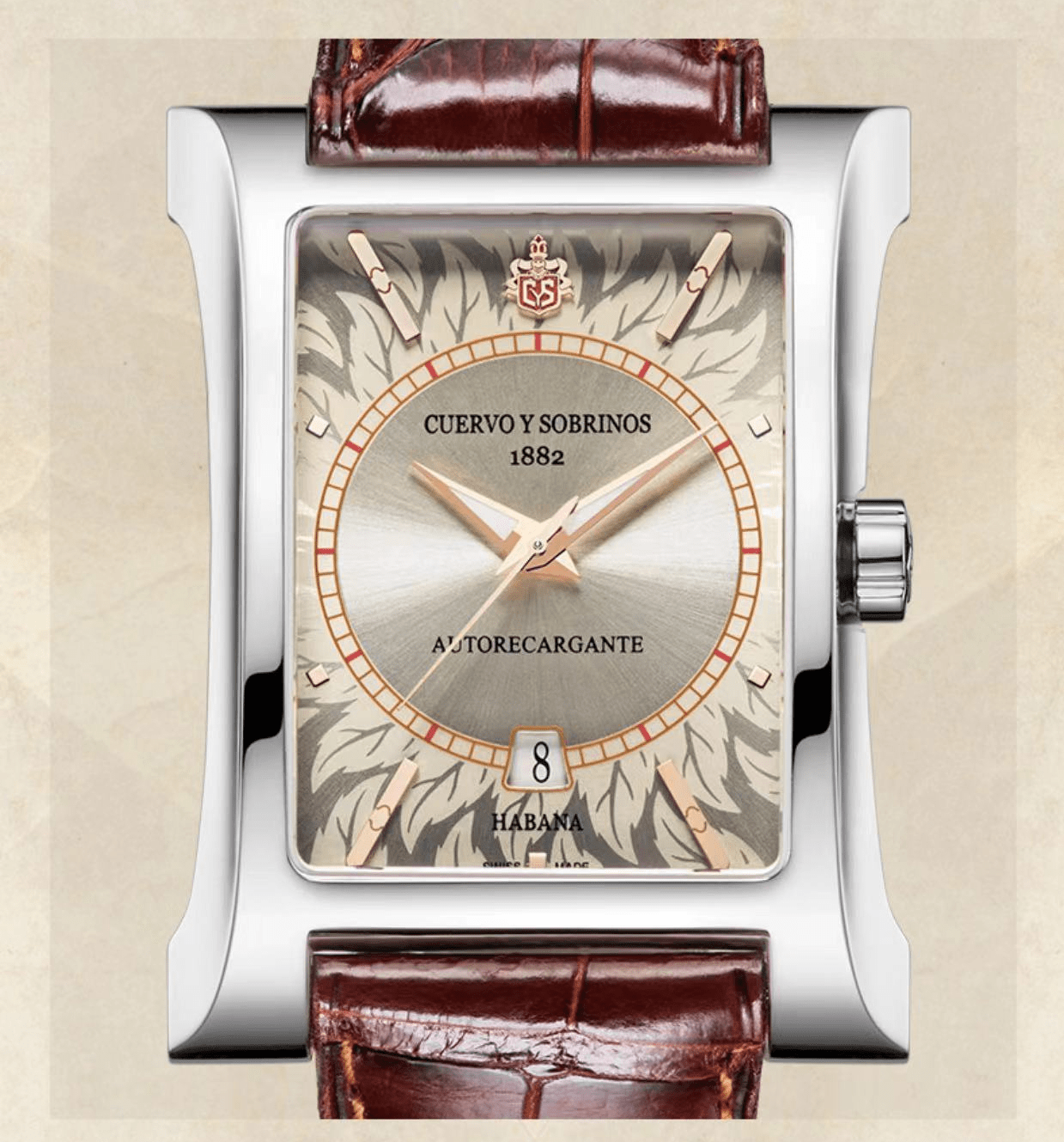 库尔沃-光彩系列2414.1CC机械男表是世界雪茄吸烟锦标赛的特别版 话说热情洋溢的拉丁风情怎样和端庄华美的瑞士钟表分离?与哈瓦那产的优质雪茄相似,库尔沃腕表的设计具有浓郁的个性,在瑞表以圆为主方为辅的氛围下,库尔沃独爱剑走偏锋,采用大尺寸矩形精钢表壳,侧面对角向下拉出霸气但文雅的轮廓,烟草色放射纹小盘搭配雪茄烟叶装饰,镀金的平面刻度,复古日历视窗,搭配路易斯安那鳄鱼皮皮带,展示出浓郁的拉丁灵魂瑞士芯的文化精髓,市场价20000元。
