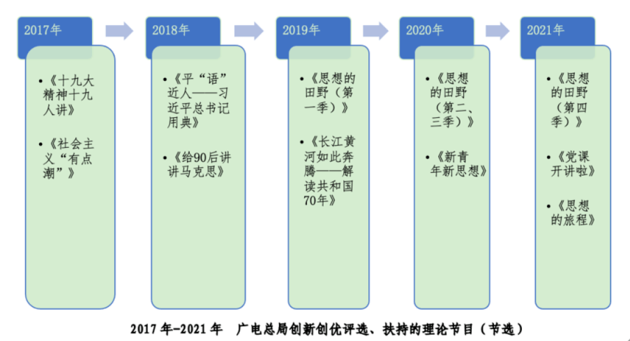 (来源:青海广电) 导读 党的十八大以来,在习近平新时期中国特征社会主义思想指引下,广播电视和网络视听深化贯彻落实中央严重决策部署,持续推进变革创新,发作了历史性变更,取得历史性成就。在迎接党的二十大胜利召开的重要时间点,国度广电智库组织撰写【十年·变】专题文章,从各个侧面,察看和剖析十年来行业改造展开的进程与成就,瞻望趋向和前景,展示全行业踔厉奋发、发明更好未来的坚决自信心和实践行动。今天刊发第四篇《用视听言语彰显新时期理论光辉》。 党的十八大以来,在全国广电系统的谋篇规划下,理论节目焕发出强大的生机生机,高质量展开取得新效果。这十年间,涌现出一批深受人民大众喜欢的理论节目,多维度宣传阐释习近平新时期中国特征社会主义思想的理论魅力与时期价值,把理论话语转化为浅显易懂的大众话语,推进党的创新理论“飞入寻常庶民家”。 一、提质增效,理论节目十年展开的三个阶段 理论节目是理论宣传的重要载体。十年来,全国理论节目在增量的同时,在质上取得久远进步,其展开大致阅历了三个阶段。 一是固本强基期。党的十八大以来,全国陆续呈现多档理论节目,从类型看,分为电视理论栏目、系列专题节目和理论文献片等;从定位看,主要盘绕学习宣传习近平总书记系列重要讲话肉体、贯彻落实党的十八大肉体和中国梦等中止消费创作传播。其中有些理论节目不时连播至今,具有较高的知名度与影响力;广电总局也适时将优秀的理论节目评选为广播电视创新创优节目,推进其在全国广电系统中止阅历交流。例如2012年推出并连播至今的《时期问答》,约请各学科的“马克思主义理论研讨和树立工程”专家参与录制,第一时间解读严重理论和理论问题,真实拉近理论与日常的距离;2016年推出的《开卷有理》于当年入选创新创优节目,作为理论读书节目,用接地气的言语打通理论直达人心的“最后一公里”,多年连播,持续让理论的精髓要义轻松暖和地走进受众心中。 二是增量提质期。党的十九大以来,理论节目深化宣传阐释习近平新时期中国特征社会主义思想,成为广电总局宣传党的创新理论的重要抓手。广电总局充沛发挥行业引导作用,进一步经过出题谋划、直接调度、专家指导、分离展播、扩展播出、调整编排结构、推优扶持等系统性举措,推进人才、资源等向理论节目汇集,并集聚系统精锐力气共同创制重点节目,鼓舞了全国办好、办精节目的士气,理论节目在全国遍地生花。一方面,由广电总局组织谋划、全国33家省级卫视接力联制联播的大型理论节目《思想的田野》,以“理论宣讲大篷车”为载体,生动反映了党的十八大以来各地践行习近平新时期中国特征社会主义思想的丰厚理论,节目持续在全国创作播出,收视持续坚持高位,真实满足了人民大众对理论宣传的新需求新等候;另一方面,中央和省级广播电视台提升创作水平,《平“语”近人》《新时期学习大会》《中国正在说》《中国共产党为什么能》《好好学习》《理响新时期》等取得不俗反响。