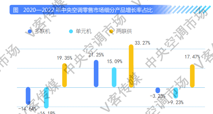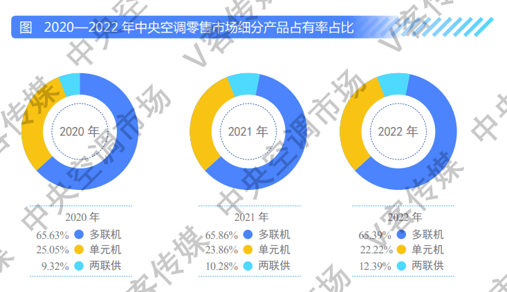 产品方面,小多联、单元机、两联供产品依旧是批发市场的三大机型。2022 年,小多联和单元机机组均呈现不同水平下滑。两联供、三恒系统、 五恒系统仰仗健康、温馨、节能环保等优势,在大平层、别墅改造等高端市场备受喜欢。与此同时,水机厂家和多联机厂家不时加大对户式水机、 天氟地水、天氟地氟产品的研发推行,市场提高 度和认知度不时提升。