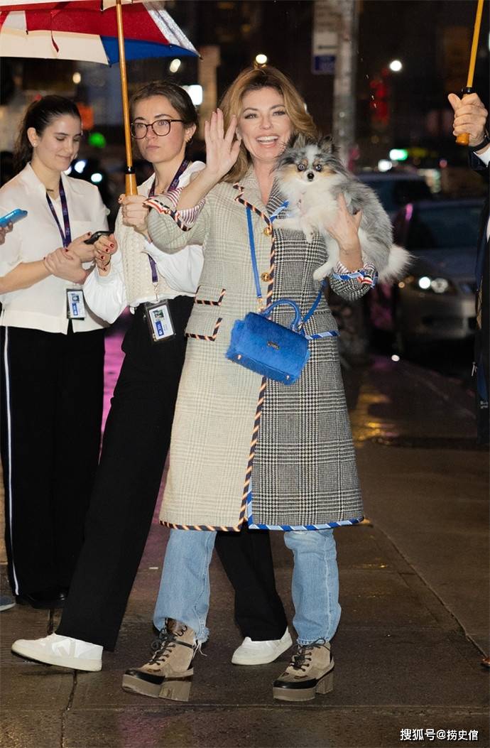 2023年1月4日,莎妮娅·吐温(Shania Twain)带着她的小狗来到“深夜秀”。她衣着一件冬季长外套、蓝色牛仔裤和一个蓝色钱包。她还用时兴的冬靴打造了这一外型。 |
