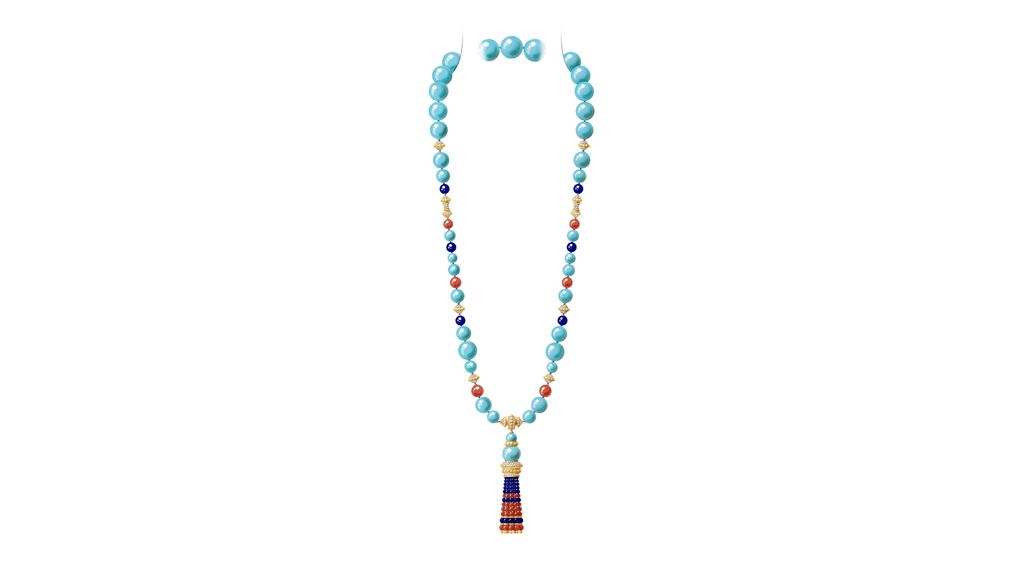 Lueur d'été可转换式长项链,由39颗直径10mm至23mm的绿松石圆珠串组而成。品牌提供