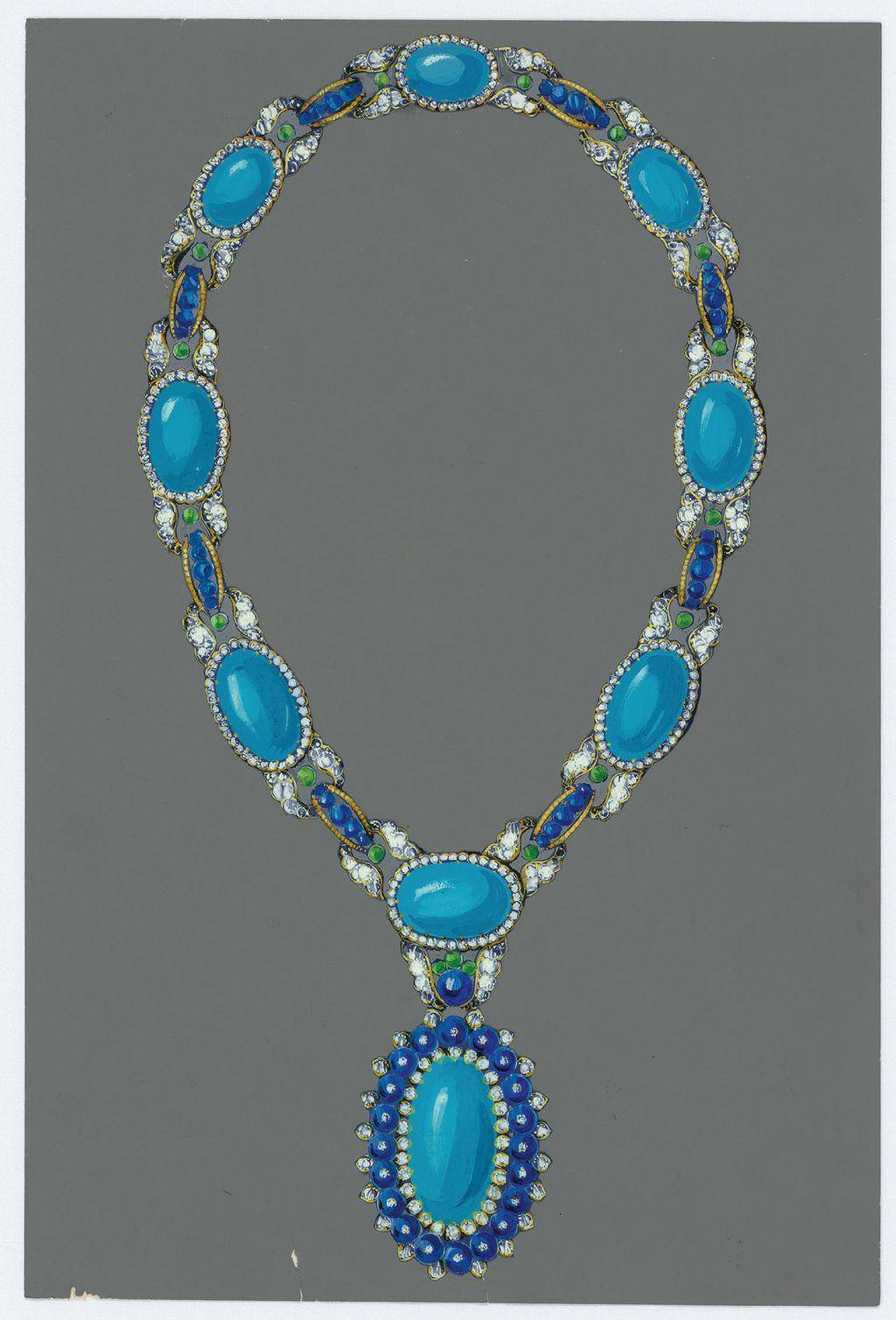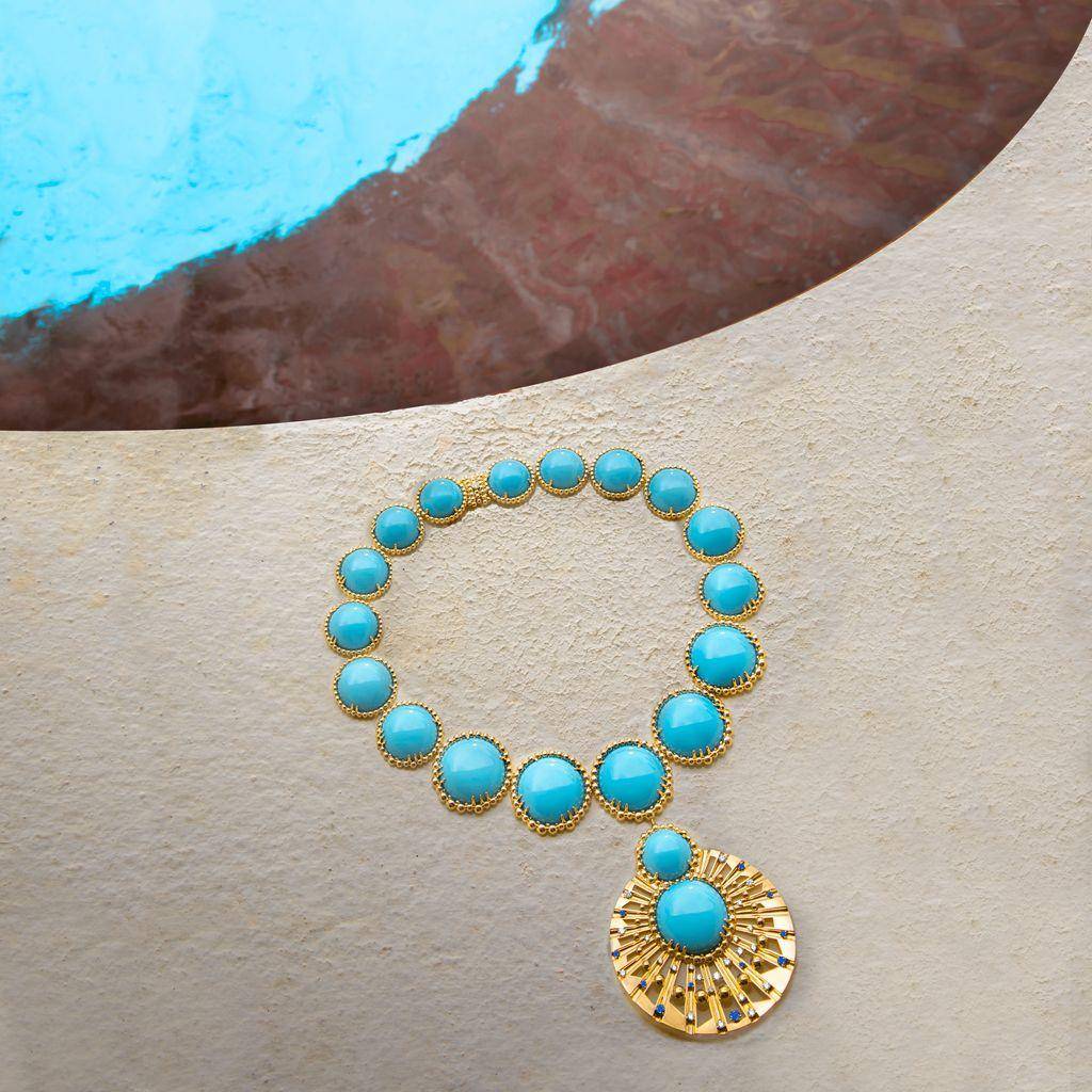 Brume de turquoise项链是匠人制造逾800小时的心血结晶,镶嵌19颗蛋面切割绿松石。品牌提供