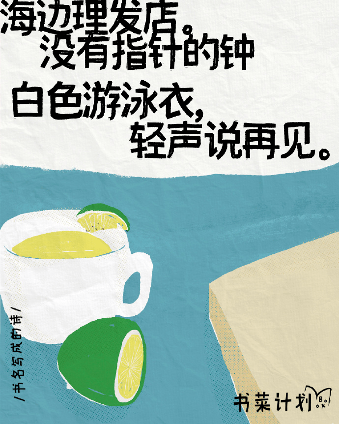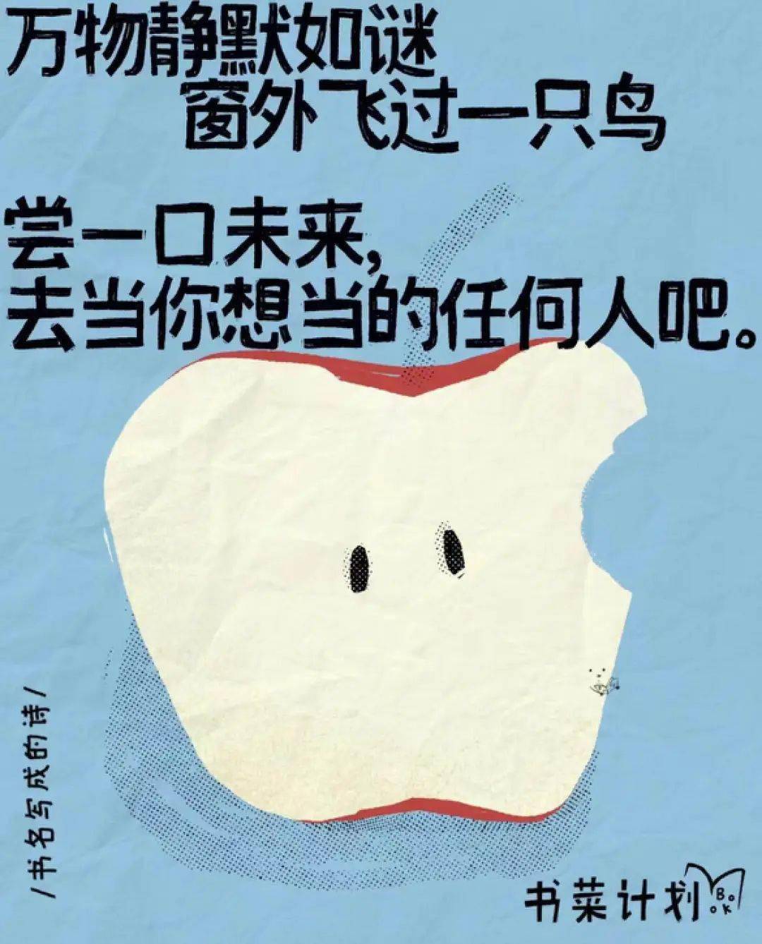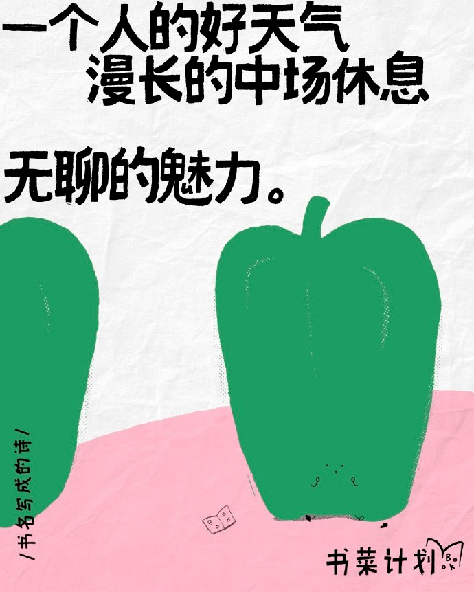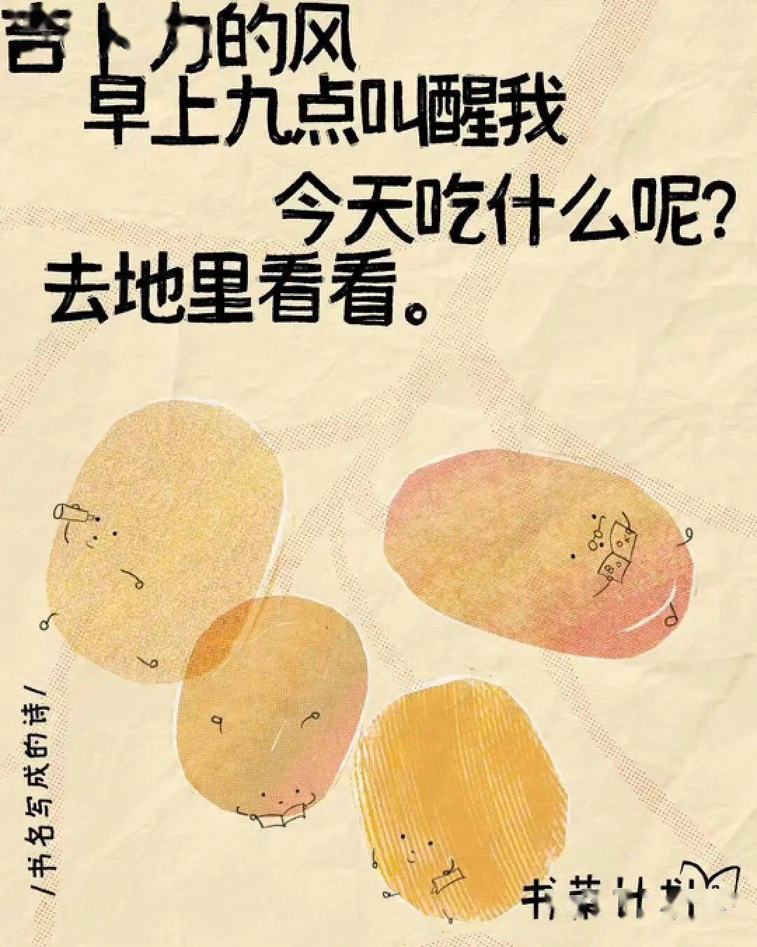 与此同时 “书菜计划”还用书名写诗 诗意的文字与背景的 瓜果蔬菜分离在一同 既有生活的烟火气 又富有文学的浪漫 解压又治愈 01 《吉卜力的风》 《早上九点叫醒我》 《今天吃什么呢?去地里看看》 ▼