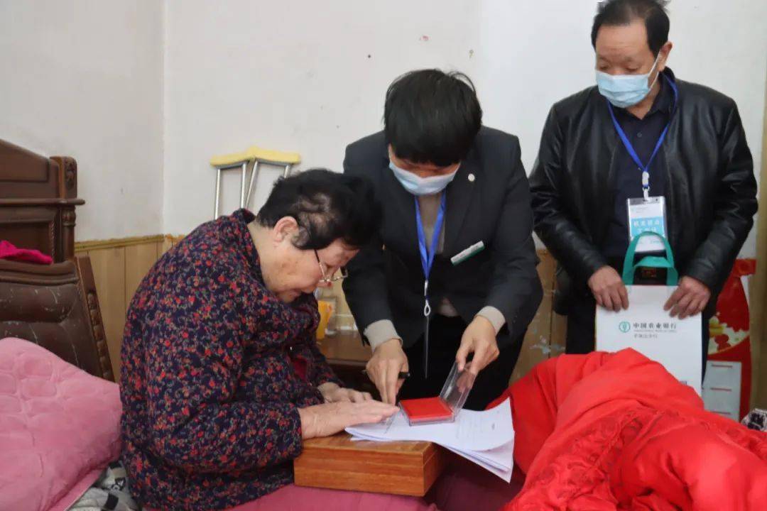 上门效劳暖人心 家住昆阳街道程庄社区的老太太廉某桂因腿部受伤瘫痪在床、老先生温某因冠心病做过心脏支架同时患有脑梗,两位老人均已年过八旬,不能外出。当天上午,叶县农行停业部主任田秀娜与运营财会部边耀生来到廉某桂家上门核实,并签署代理委托受权手续。