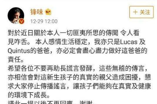 04 离婚后,谢霆锋和天后王菲言归于好,而张柏芝生下三胎“小王子”,神秘的是,往常也不知道小王子的生父是谁?有网友传言是谢霆锋的,但不久,谢霆锋在微博上发声廓清自己,说他只是谢振轩和谢振南的父亲,婉转的撇清与张柏芝三子的关系。