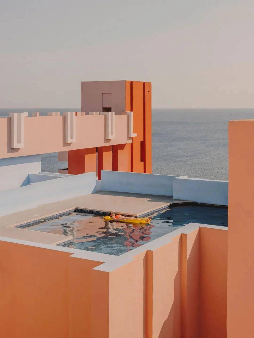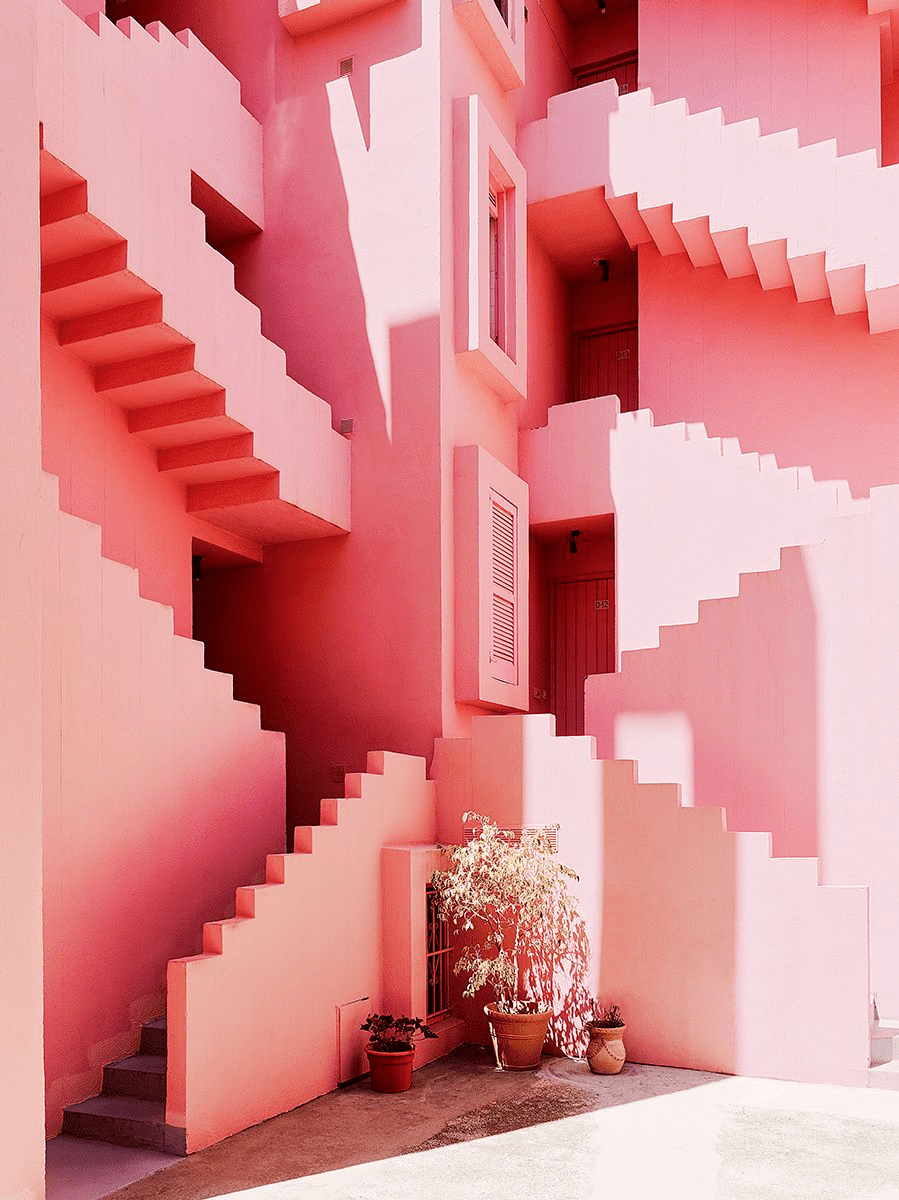 红墙公寓/Ricardo Bofill Ricardo Bofill于1973年在西班牙地中海度假区设计建造的红墙公寓以高饱和的单一颜色打造了梦境的世外桃源。