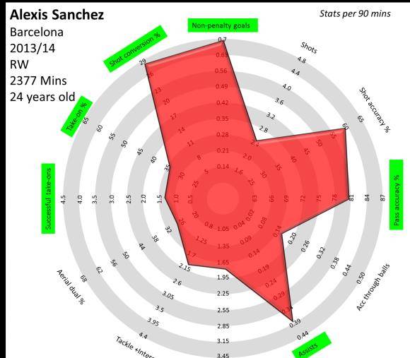 桑切斯具有的众多优点之一就是他的终结才干和为他人发明机遇的意愿,在上面的图中,可见桑切斯具有少见的能够在各种不利位置得分的才干。在我眼里,他是那种他的名字或者最好说成他的竞赛里自带“无中生有”这一技艺的球员,他具备顶级前锋所具有的的各种技艺。他在赛场上总是能够很好的拿住球,在背身时分保障拿住球并尽可能地减少移动,以便与身边边锋,10号以及B2B中场中止换位传球。