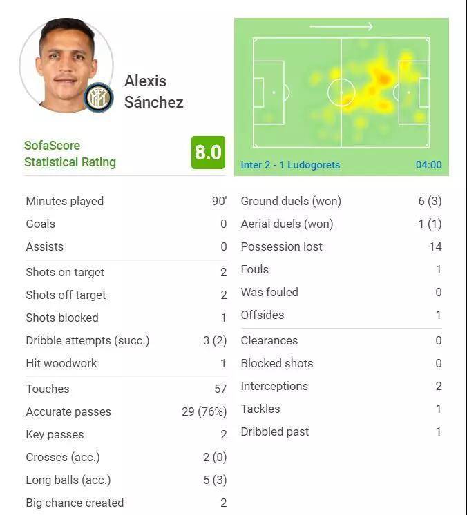 皇冠一旦掉落,就很难再次戴上。在转会曼联之后的这半个赛季,在进攻端方面,他的场均关键传球只需2.2次,发明的绝佳机遇只需3次,还不到冬窗前在阿森纳的一半,在12场竞赛中,场均射门次数仅有1.6次,场均射正0.8次,在掌握机遇的才干上也只需20%,在这几项重要的进攻数据上都呈现严重的滑坡,在进球方面更是只需两个不痛不痒的进球,但这却曾经是他在曼联最高产的时期,可见随后的一个赛季,他的表示有多么糟糕。 假如桑切斯当时转会的是曼城而不是曼联,会不会呈现这种严重的水土不服我们不得而知,但是我们能够肯定的是,穆里尼奥的这桩转会是彻底的失败,不只是关于曼联,也是关于桑切斯的职业生活。假如硬要给这场转会安一个名字,那就是阿莱克西斯的滑铁卢。 重回初恋之地,在梅阿查重新起航 由于伤病的缘由,智利人在国米的机遇也不是很多,但是我们从两场竞赛的剖析就能够知道,或许他曾经忘掉曼彻斯特,在梅阿查球场重新动身。