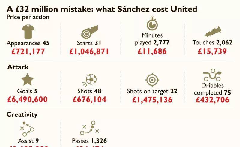 每次出场:72万镑;每次首发:105万镑;每分钟出场:1.2万镑;每次触球:1.6万镑 每次进球:650万镑;每脚射门:68万镑;每次射正:148万镑;每次完成过人:43万镑 每次助攻:360万镑;每次传球:2.4万镑 经过和其他两位大牌球员的对比,我们就更明晰明了的知道何为毒药合同。一句话总结:各种奖励加上,桑切斯税前41万镑/周(若首发每场税前7.5万镑出场费),博格巴税前31万镑/周(有欧冠)税前27.4万镑/周(无欧冠),卢卡库税前23.5万镑/周。 桑切斯:税前年薪约2400万欧,税后1320万欧。每踢90分钟曼联需付210万镑,是博格巴的5.5倍,卢卡库的4.6倍 博格巴:税前年薪约1800万欧,税后990万欧。每踢90分钟曼联需付38.5万镑。 卢卡库:税前年薪约1370万欧,税后750万欧。每踢90分钟曼联需付45.6万镑。 所以在呈现严重的高薪低能的现象后,无论是索尔斯克亚还是曼联球迷,都不可能欢送迷失在老特拉福的的桑切斯,他更像是走到了一个被封住后路的十字路口,只能继续向前,向下一站起航。 同是一身红衣裳,为何沉沦在曼联 在转会曼联前,他是智利C罗,他是枪手大腿,他是身价高达7000万欧元的神锋,他身体矮小矮壮却盘带华美、速度奇快,他有着娴熟的脚下技术和出众的灵活性,技术特性标新立异,不只盘带的动作不亚于C罗在20岁的时分,有才干盘过任何后卫,而且脚下频率超乎常人想象,看他踩单车以至比罗比尼奥和大罗纳尔多还快,爆发力不亚于巅峰时期的小罗。 但是在转会曼联,他收获最大的美称就是合格的饮水机管理员,每天忠实的为队友效劳。而球迷则直言他是曼联队史上最大的水货,即便人们都知道他的实力,但是水土不服也是水。这里我们经过对比阿森纳和曼联时期的数据,来看看他究竟发作了多大的变更。
