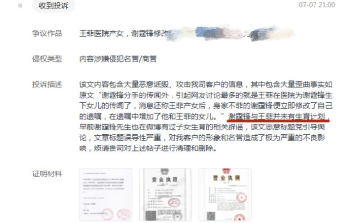 此前有网友造谣称王菲在医院为谢霆锋生了个女儿,结果被谢霆锋公司投诉,投诉描画中表示二人并没有生育计划。