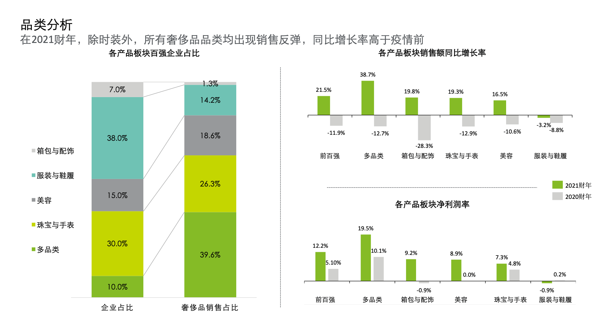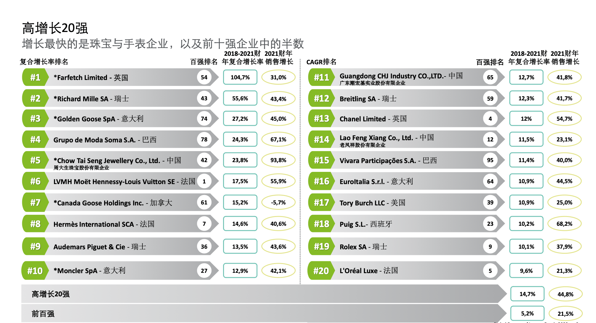 全球朴素品行业十强 瞻望2022年,前十强的品牌在朴素品行业销售额百强中的份额增至56.2%,较上年增长4.8%。 归入百强榜的朴素品企业涵盖传统顶级朴素品(ultra luxury)、高档朴素品 (super premium)和敬慕型朴素品(aspirational luxury),以及平价大众朴素品(affordable/accessible luxury)——这是一个相对较新的朴素品类别,产品在高端批发 市场中销售但价钱对中产阶级消费者而言可担负性更强。各品类均包含强大的消费品牌。 路威酩轩集团 开云 雅诗兰黛 香奈儿 欧莱雅 历峰集团 爱马仕 周大福 劳力士 中国黄金集团黄金珠宝股份有限公司 (这个令人意外!) 企业按2021-2022财年朴素品兼并销售额排名 非美国企业的净销售额均按美圆计算。汇率对排名有所影响。