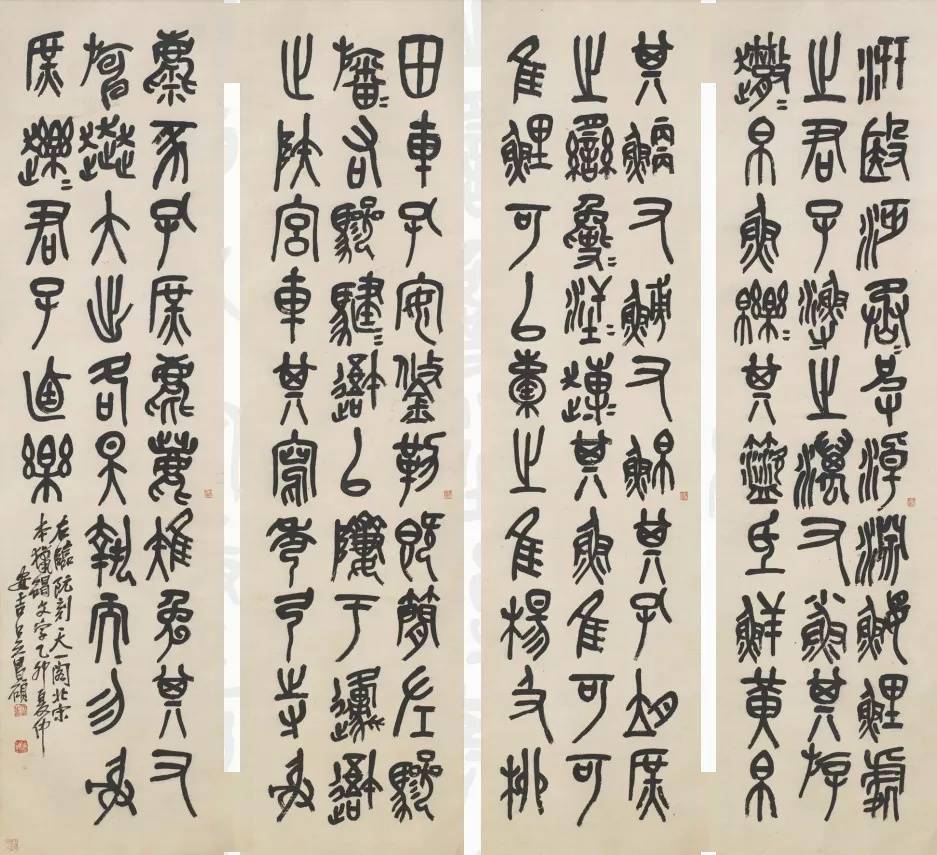 韩天衡|百川入海——二十世纪海上书坛散论(二) 海上百年争奇斗艳的书风 在上海这个多元文化中心,在历史兴替改造的背景中,在新旧文化的融合碰撞中,在新兴市民文化审美的激起中,二十世纪海上书坛历百年变更,以自由开放的平台空间容纳着不同人文背景、阵营浩荡的几代书家,呈现出多姿多彩、体貌各异的书法作风。 以下试将海上代表性书家的书风作一大约的归类,择其要者简加评述。 (一)碑派书风,各逞其妙 从乾嘉金石训诂之学兴起,至道咸碑派书风在阮元、包世臣的鼓吹下逐步占领主流。至1889年随着康有为《广艺舟双楫》的盛行,碑学思想得到进一步鼓吹,碑派书风大有一统天下之势。以前清遗老为中心的民国海上书坛在此历史审美背景下,碑派书风占领了主导位置。海上书家在承袭碑体习尚的同时,面向自由而嗜好尝新的艺术市场,仰仗各自的学识贮藏和个性审美,寻求变通、自开生面的创作理念一直生动,这使民国碑派书法在上海的持续也变得争奇斗艳。 吴昌硕是诗、书、画、印四绝一通的巨匠,也是海上艺苑的标杆性人物。书艺以篆名世,扎根猎碣十鼓,专情数十年,由似至不似,自成新格。所书石鼓变其形而攫其神,左右揖让,取势盘搏,折股屈铁,古拙遒健,独树一帜。他在强调“与古为徒”的同时,更注重“当出己意”,是汲古来新的榜样。