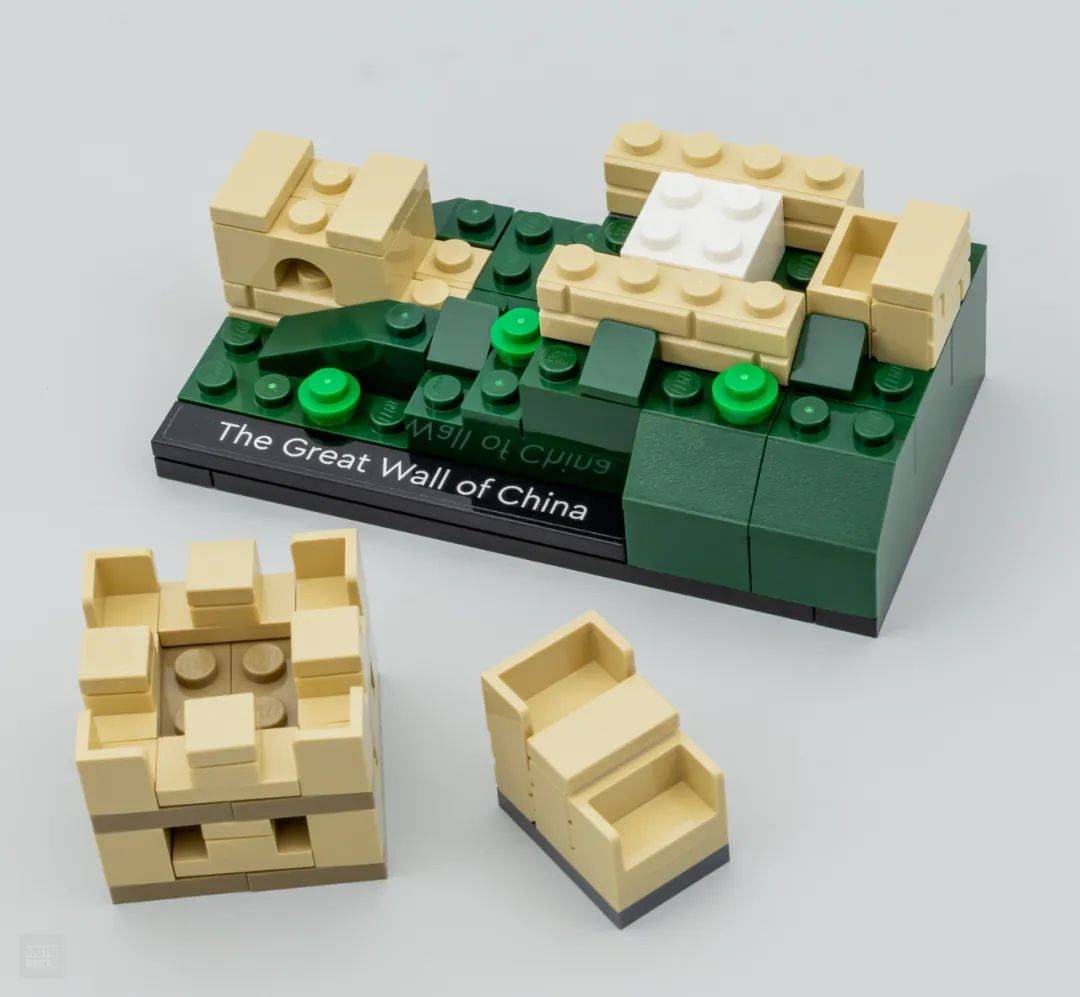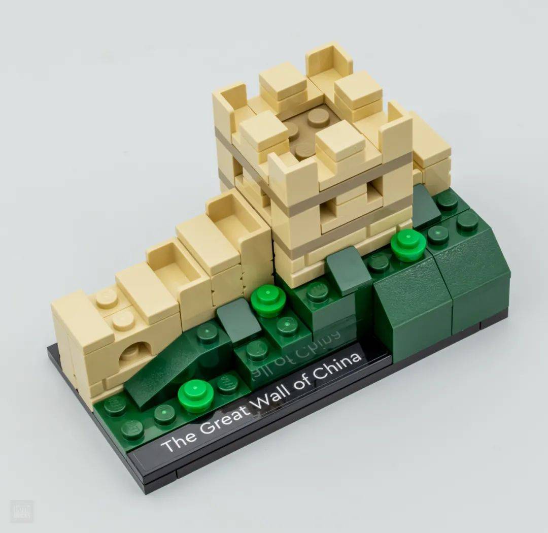 中国长城的配色和套装乐高21041 中国长城运用的米色一样。建筑搭建在12×6的黑色底板上,开端先用深绿色的零件拼搭出地形和草地,在依次将几段城墙模块装置在地形上。