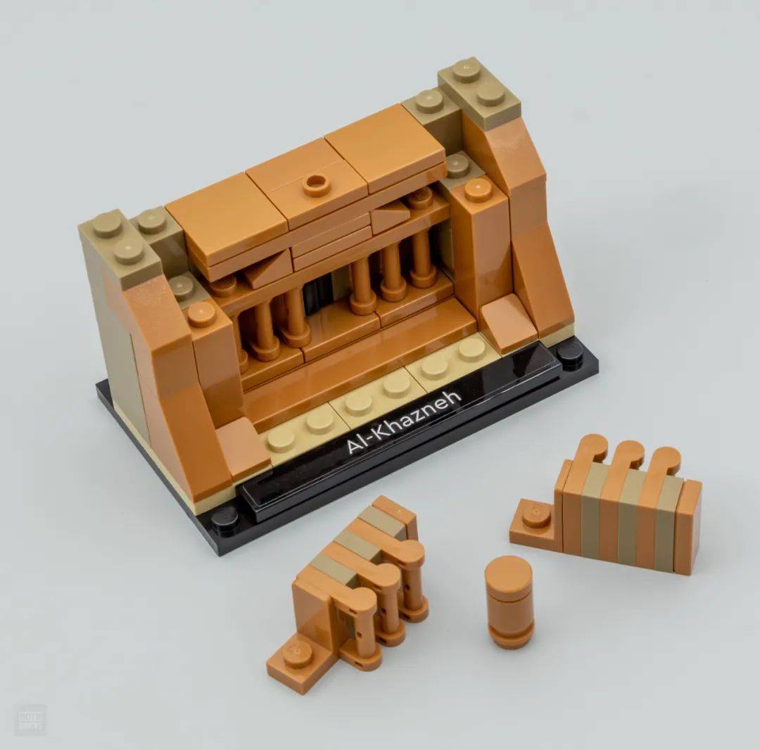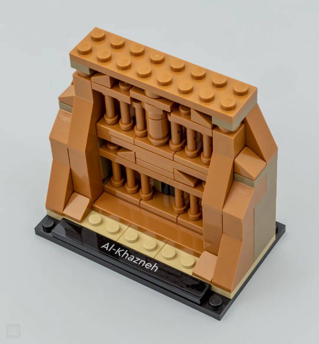 接下来是一座罗马科林斯式神殿,卡兹尼神殿,也被称卡兹尼宝库。它运用了10×6的黑色底板,先用三块米色的板铺垫表示沙漠空中,在这之上搭建的神殿结构运用了SNOT技巧,将6个带有手柄的特殊板水平放置来表示神殿建筑外的廊柱,十分巧妙。