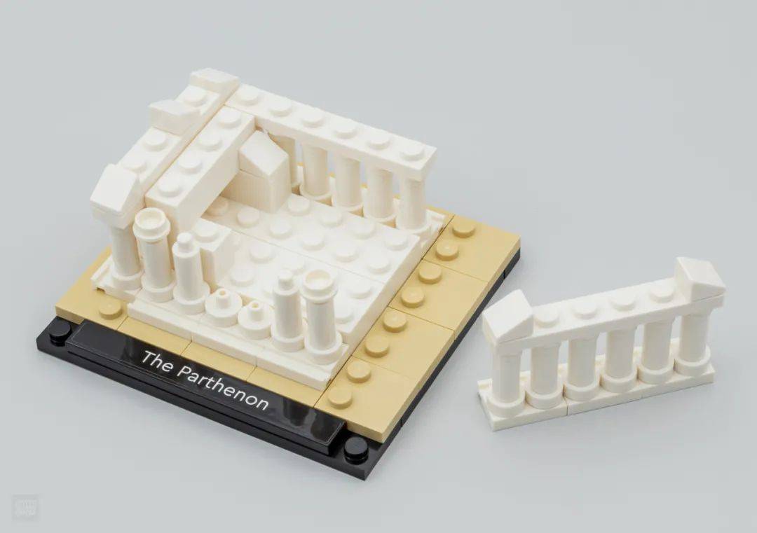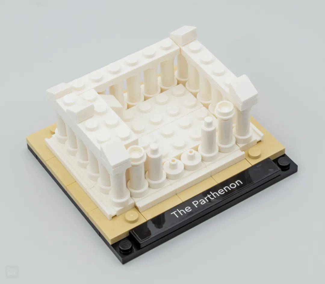 最后一个是位于雅典的帕特农神庙,这座两千多年前的建筑往常只剩残缺的石柱。这一座迷你建筑也恢复了这一点,在10×9的底板上铺设了米色零件代表空中,之后运用白色的特殊板表示出三层台阶,用蜡烛零件搭建石柱,可惜润滑的零件名义无法表示出原建筑精巧的雕琢。