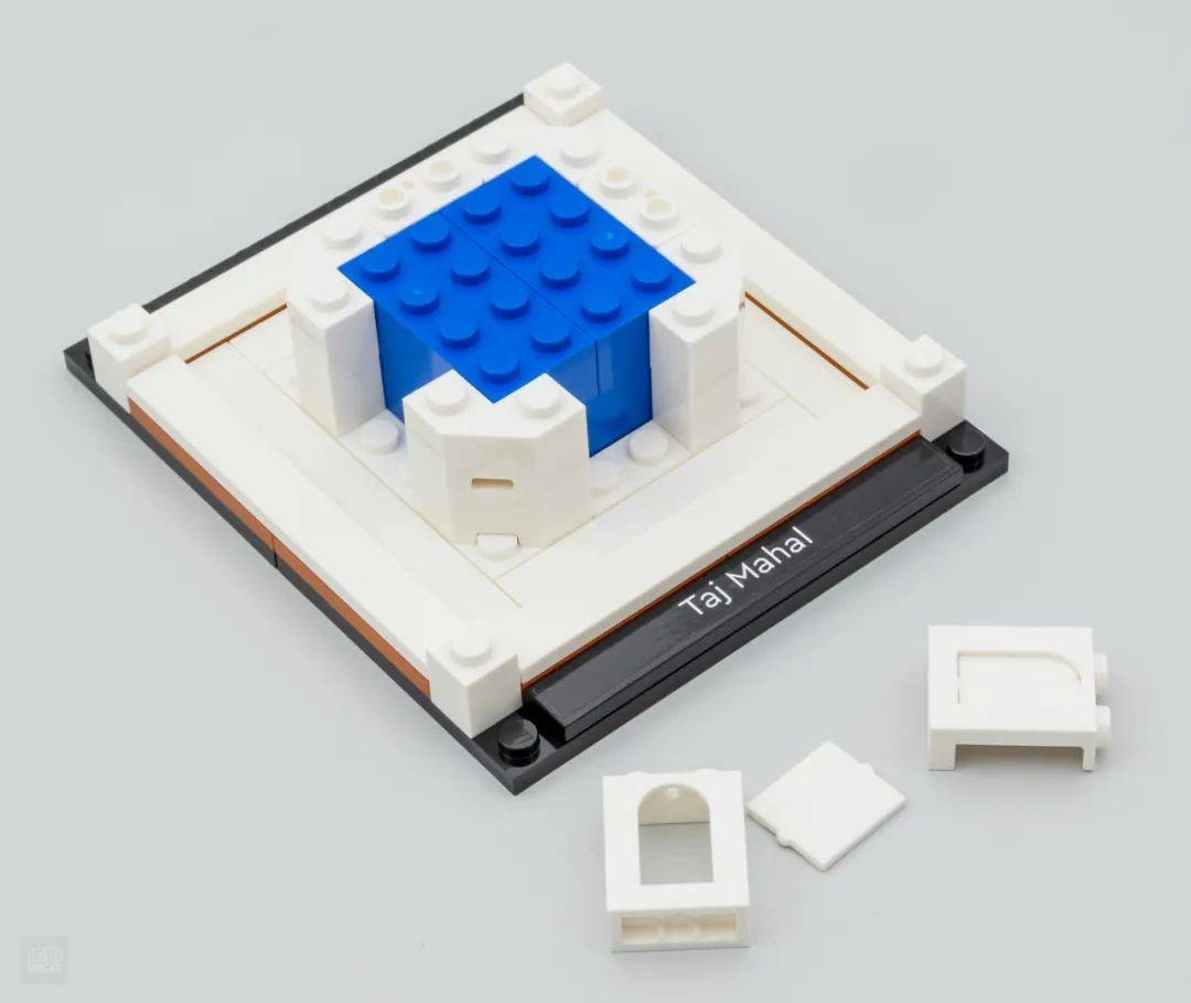 以被称为“世界新七大奇迹”的印度泰姬陵为例,每个建筑都有一份贴纸完成的铭牌,水平拼搭在建筑正面。建筑搭建在10×10的黑色底板上,这个设计和星球大战系列的平面模型一样。白色的光面板零件铺满黑色底板,营造出和建筑颜色一样的洁白的环境,内部的填充是蓝色的砖块。