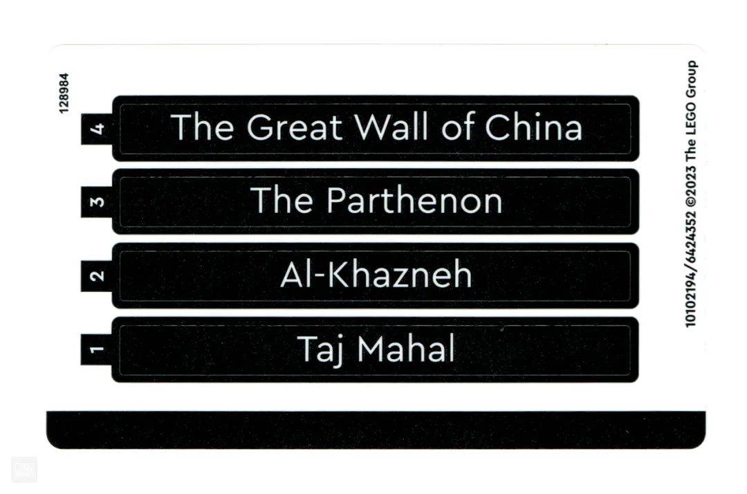 套装内共运用了4个贴纸,恰恰是四个建筑黑底白字的留念铭牌。关于乐高建筑系列其他运用印刷留念碑的套装来说,运用贴纸的铭牌太糟糕了,不外作为一个GWP满赠套装,我也忍了。