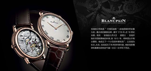五、宝珀 (BLANCPAIN) 宝珀是现存历史最久的、最古老的腕表品牌(没有之一)。自1735年树立以来,每一只表制造过程全部在古旧的农舍内中止,由个别制表师亲手精工镶嵌。直至今日,每一枚Blancpain表均由制表师亲身检查、刻上编号及签名为记,其质量管制之严厉,与多年前的做法无异。