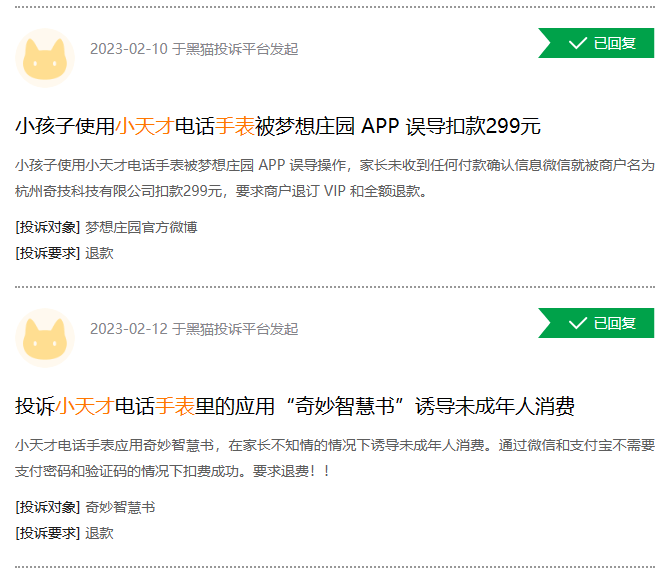 黑猫投诉截图 截止2023年2月20日,黑猫投诉平台上触及儿童手表的投诉累计1800余条,相关投诉问题主要触及手表应用程序诱导未成年人消费充值(103条)、应用程序歹意扣费(203条)、手表产质量量问题(160条)、手表通讯运营商效劳及费用问题(609条)。