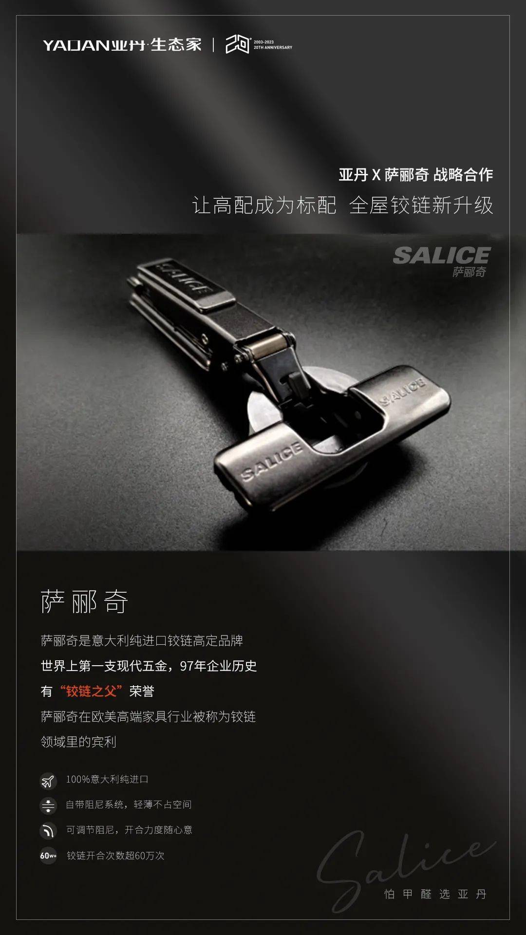 亚丹家居 X 萨郦奇SALICE 环保定制柜与高端五金的分离 同时具备杰出的设计与精工匠心的工艺 SALICE萨郦奇 独有的双并列阻尼引擎 平均受力,平稳运转,轻薄不占空间 阻尼可调理,开合力度随心意 一次装置,终身耐用!