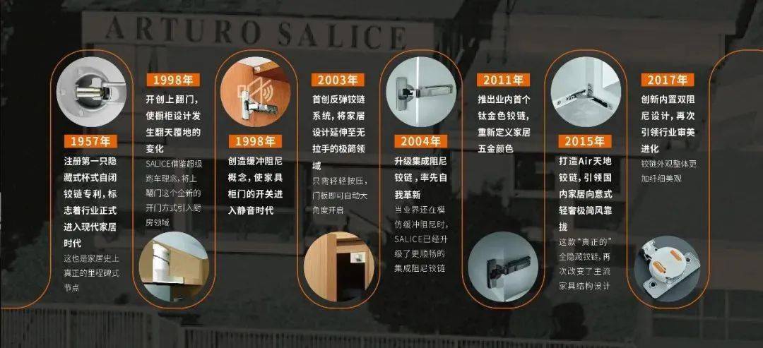 迄今为止,SALICE萨郦奇的产品 超3000种,具有约600项专利 大家十分熟习的柜门铰链的 阻尼缓冲功用、集成阻尼概念、反弹铰链 钛金黑色铰链、跑车铰链、天地铰链等等 都是SALICE萨郦奇对五金行业持续不时地贡献 引领着世界五金行业行进