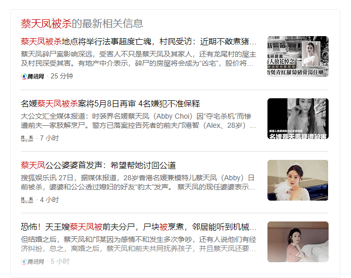 在搜索引擎上搜索蔡天凤被杀一案的结果。 而在这次香港女性蔡天凤被杀案中,不同类型媒体的题目也表示出不同特性。 传统媒体的报道大多数含糊了凶手的作案手法和案发现场环境,以陈说事实为主,没有“什么部位在哪里被发现”“大揭秘”等字样。如BBC的 <Abby Choi: Ex-husband charged in gruesome Hong Kong murder> (《蔡天凤前夫被控可怕的谋杀案》)和红星新闻的《音讯传来:部分遗骸被找到!前夫一家4人不准保释,3人有前科》。而大多数信息聚合平台的题目表述,则令人不忍卒读乃至生理性不适。 但可惜的是,在题目之外的正文中,这些媒体都或多或少地描画了案件的细致细节。