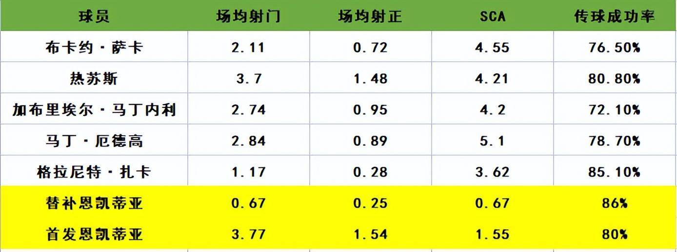 学问。本场竞赛,恩凯蒂亚梅开二度,展示了火力,辅佐球队取得了一场重要的胜利。 没有“第终身命”的恩卡蒂亚,居然有“第一动力” 在阿尔特塔执教阿森纳期间,他看到了恩凯蒂亚的培育,但在没有锋线的阿森纳,他依旧是替补锋线,固然奥巴梅扬和拉卡泽特都离队了。不外看看这些年的数据,大部分替补出场的数据和表示都不错。7个进球。 往常22/23赛季,为阿森纳出战26场打进9球助攻1次的恩凯蒂亚12场替补出场,14场首发。在下面的图表中,我们能够看到在作为替补的十二场竞赛中,Nketiah场均只需0.67次射门,只需0.25次射正。更好的数据仅占胜利传球的86%。数据显现,恩凯蒂亚在替补席上破费大量时间中止传导,很少取得投篮或得分的机遇。但只需他首发出场,他就贡献了3.77次射门和1.54次射正。它也能够在SCA中贡献1.55倍。作为一名优秀的单前锋,他不只能够充任终结者,还能够充任假前锋,辅佐球队开路,为队友发明投篮机遇。 除了比安克蒂亚在替补和首发之间的表示数据外,恩克蒂亚作为首发的效率要好于萨卡、热苏斯和厄德高等阿森纳的一些主力球员。