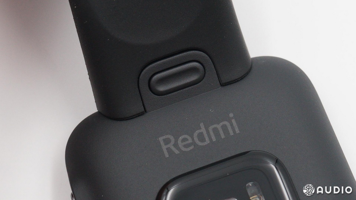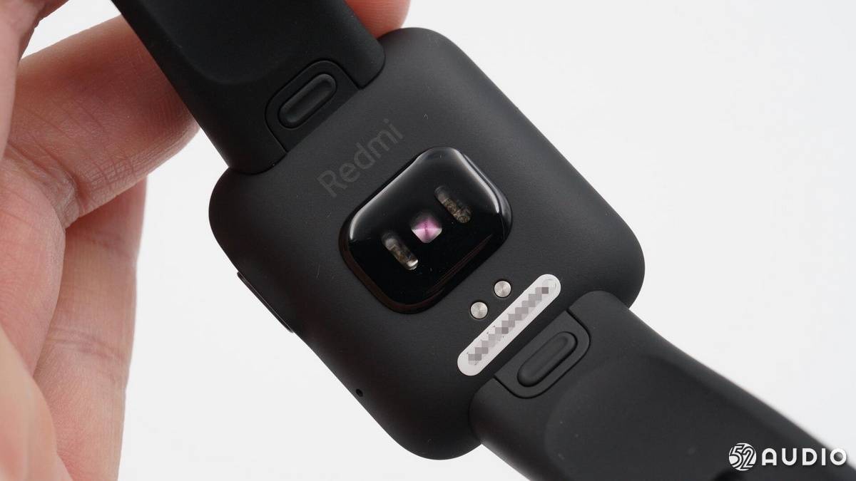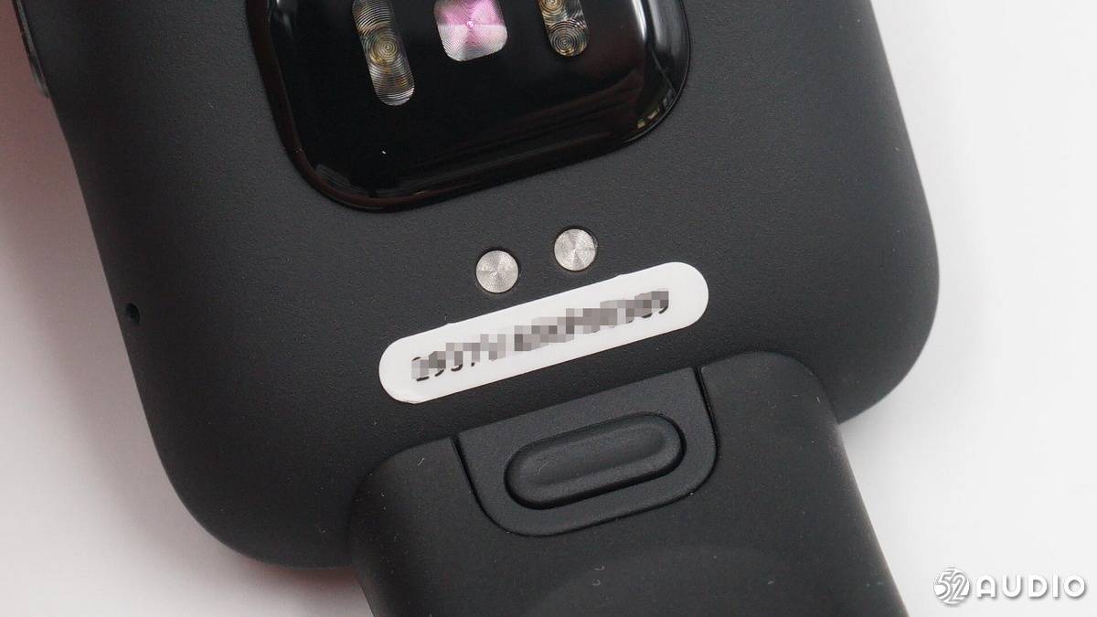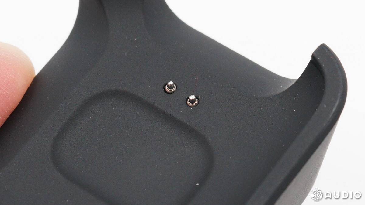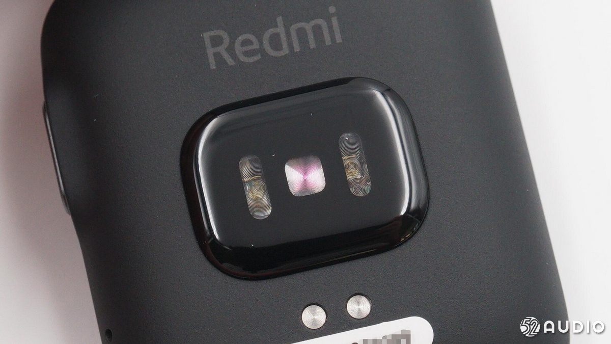手表内侧外观一览,中间位置放置传感器模组,上下两侧分别有Redmi品牌LOGO,和用于充电的金属触点。