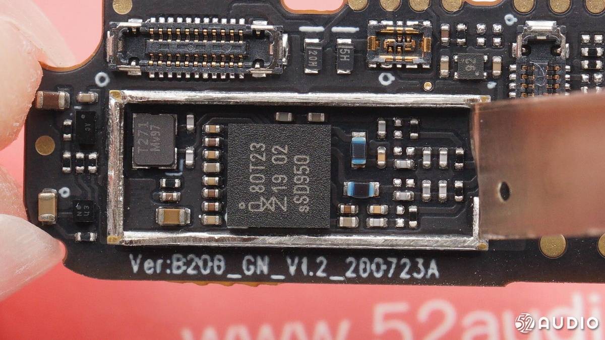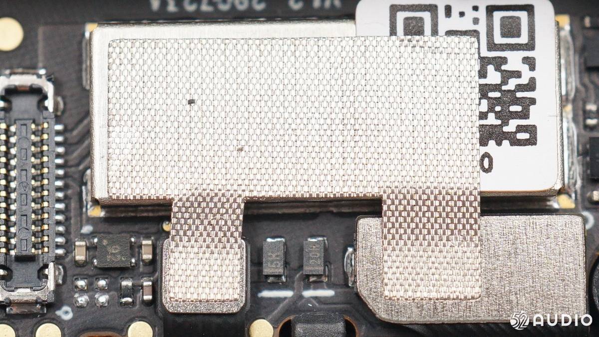 来到主板部分,主板正面被大面积屏蔽罩掩盖。屏蔽罩上贴有导电布和丝印二维码。