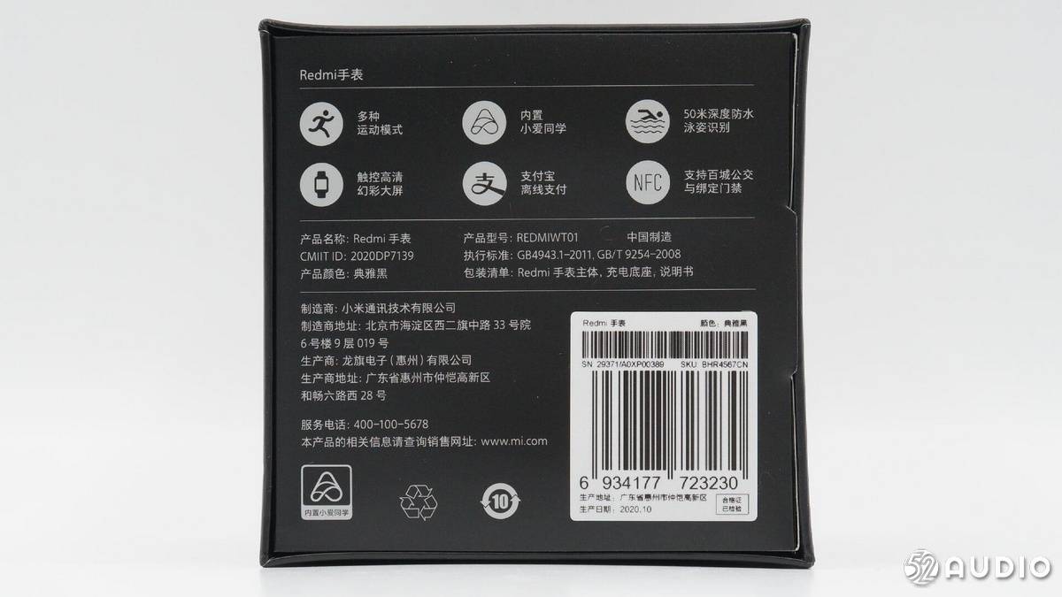 背面有图文展示的多种运动方式、内置小爱同窗、50米深度防水泳姿辨认、触控高清幻彩大屏、支付宝离线支付、支持百城公交与绑定门禁6项产品功用特性。以及部分产品信息,产品称号:Redmi 手表、产品型号:REDMIWT01、CMIIT ID:2020DP7139、执行规范:GB4943.1-2011,GB/T9254-2008、产品颜色:典雅黑、包装清单:Redmi 手表、充电底座、阐明书;制造商:小米通讯技术有限公司等。