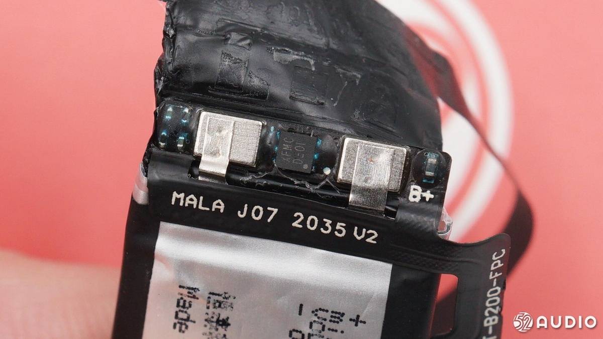 电池配备有电路维护小板,小板上有一颗丝印XFMC DE01的电路维护IC,维护板右侧是一颗检测电池温度的热敏电阻。