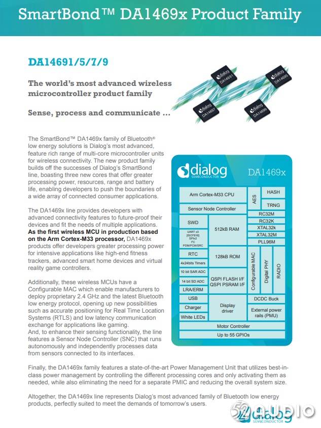 dialog DA14695 无线微控制器,DA1469x系列Bluetooth低能耗处置计划是Dialog最先进、功用最丰厚的多核微控制器单元,支持蓝牙5.1规范,内置电池充电器,支持I2C,SPI和GPIO衔接外设。