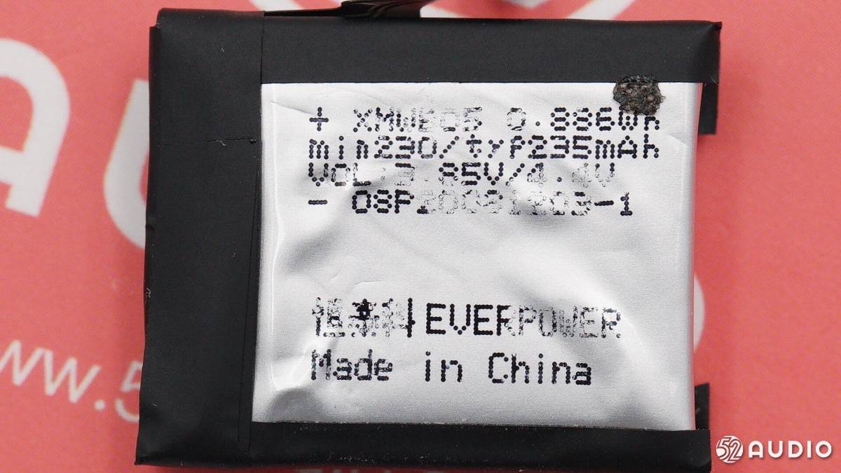 电池周围有黑色贴纸防护。电池型号:XMWE05;容量:0.886Wh,235mAh;额定电压:3.85V/4.4V,来自EVERPOWER,中国制造。