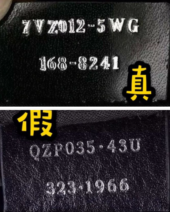 4、序号 fendi序号字母特征似gucci,运用衬线字体,在字的笔画开端、终了的中央有额外的装饰,而且笔画的粗细会有所不同。 正品序号数字皆有粗细变更,2首尾都有装点物,5在收尾处有明显的圆点,6头顶是直斜线; 仿品是规范字体,数字均无粗细突变与多余装饰。