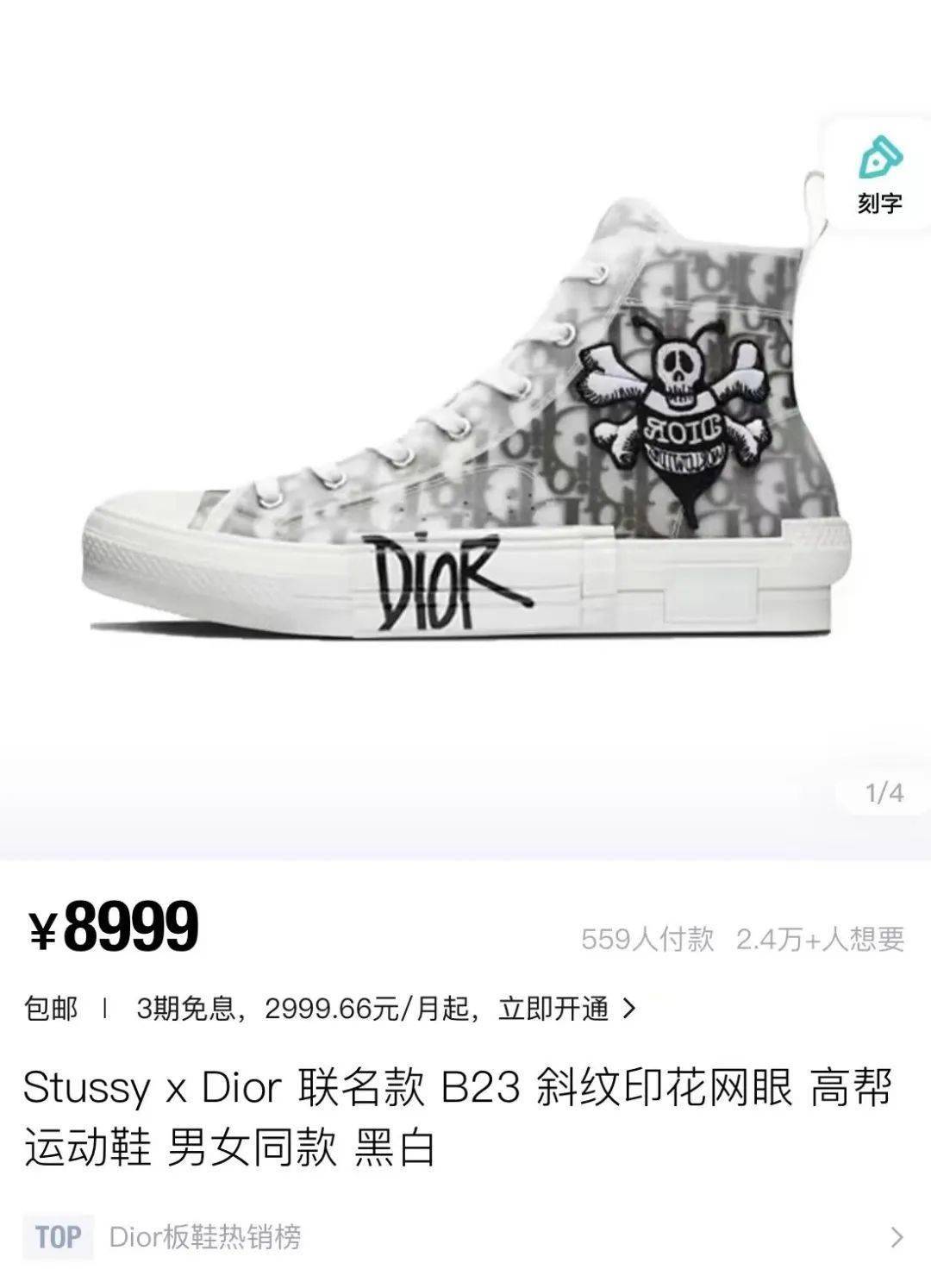 其实同时期的Dior做了不少创新,和Nike的联名鞋款热度极高,对比之下Dior x Shawn Stussy这双联名鞋款却丝毫不逊色,或许就得益于这次联名作风的大胆及突破性。鞋身的刺绣图案以及手写体的Dior logo突破常规,足以成为这次联名鞋款的大卖点。这款鞋也是Dior板鞋类的热销榜单品。