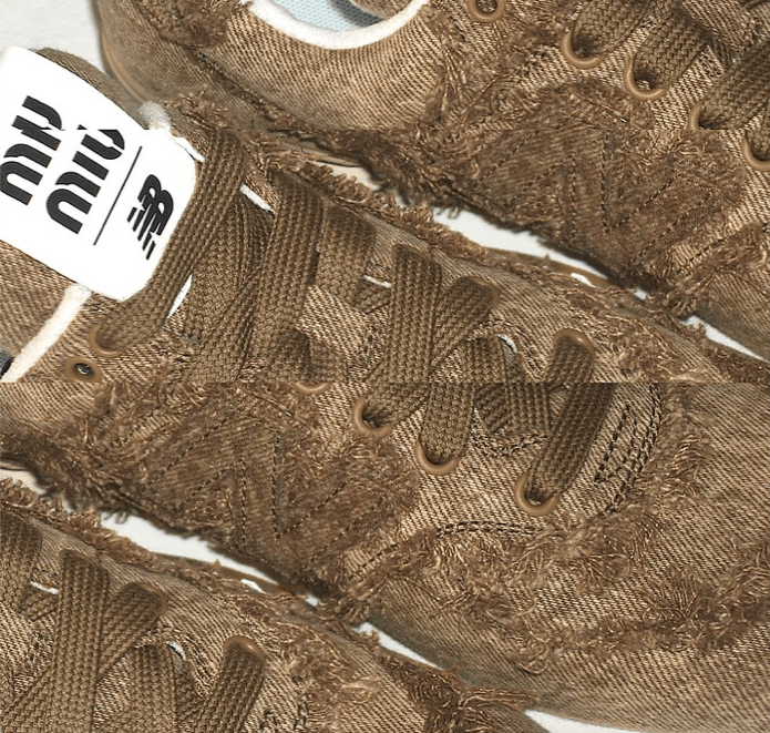(图片来源:Miu Miu官网) 鞋面及鞋身有多处破坏毛边的自然形态,运用牛仔面料突破传统运动鞋的质感,也更年轻更街头,鞋舌处有双方联名的身份标识。