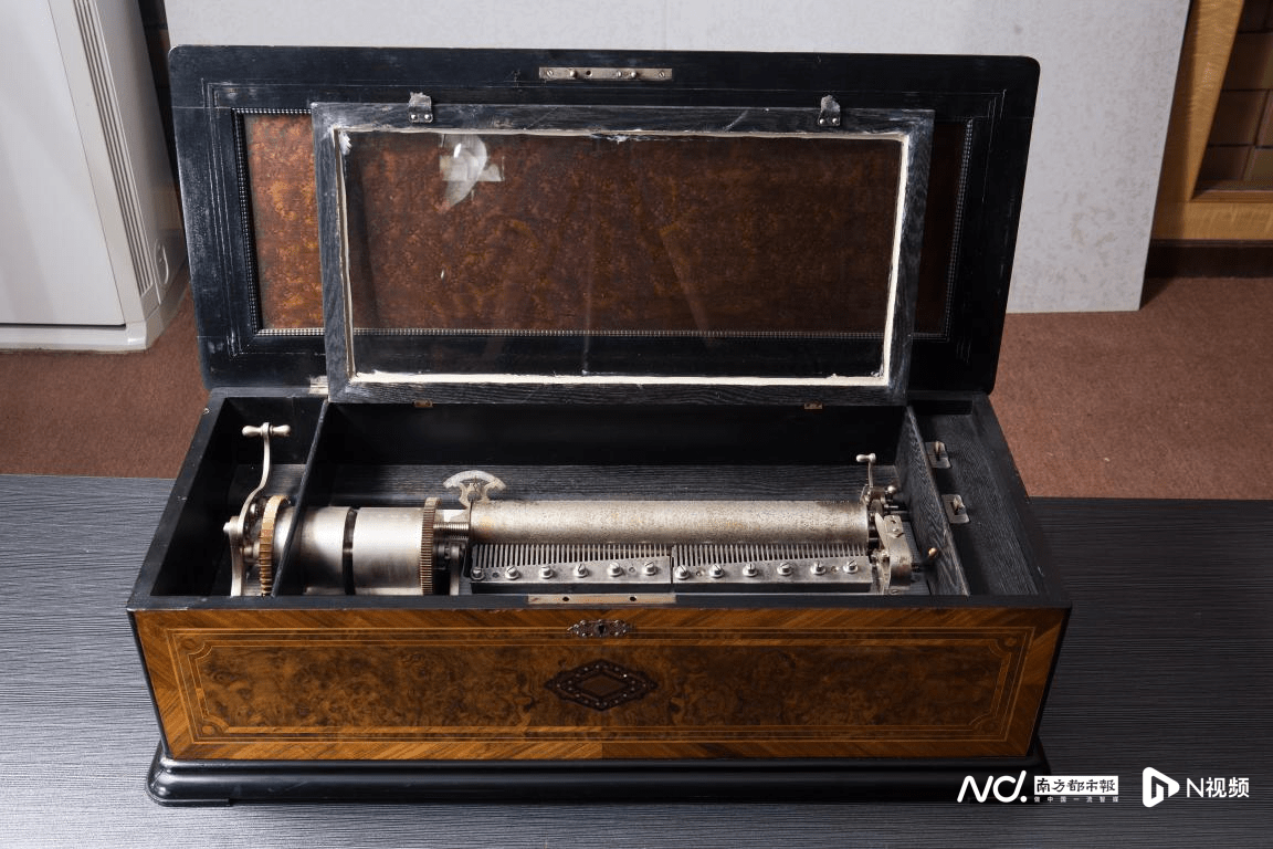 镇馆三宝之一:Sonara柜式留声机 音乐钟是八音盒的前身,古董钟展区内,1860年鎏金基座氧化钴人物壁钟、1870年鎏金壁炉钟、1880年大理石廊钟很是亮眼。进入音乐盒展示区,一根布满密密麻麻小孔的圆筒吸收了N视频记者的眼光。“1796年,瑞士人安托·法布尔开发了圆筒型八音盒,这是世界上最古老的八音盒。”1886年德国人帕尔发明了圆片形八音盒,八音盒载体由圆筒变为圆盘,这也是最早唱片的雏形。这个名为polyphon的圆盘音乐盒产自19世纪80年代德国。由polyphon musikwerke初次制造的机械装置。除了播放载体的形态发作变更,八音盒外形也发作改动。为了顺应王公贵族举行大型舞会的需求,超大型音乐盒应运而生。