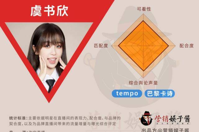 不时以来,王俊凯作为顶流之一,所带来的流量加持作用众目睽睽。但是这样的“红利”近期似乎削弱了不少,当天品牌出镜观看人数增量效果并不显著。 更值得留意的是,在出镜中,王俊凯坐在出镜间中央,掌管人站在他身侧。岂但视觉观感,令人压制,并且出镜的大部分时间,都是掌管人在引见产品,而在王俊凯只是端坐在那里,生硬地展示饰品,即便偶尔机械地回答掌管人抛出的问题,也仅仅只需三言两语。 不可承认,这种“求稳”“一丝不苟”的出镜作风,或许与品牌“高端”的调性相关,但同样还是让人再次提出质疑,明星参与出镜能否只是承担了引流作用,而在出镜间,他们仅仅只是作为“不祥物”。一朝一夕,公众对品牌产品、对艺人参与出镜的公信力,势必会遭到影响。 红 榜 虞书欣 X tempo、巴黎卡诗 3月,虞书欣参与了 tempo、巴黎卡诗等品牌的淘宝出镜活动。
