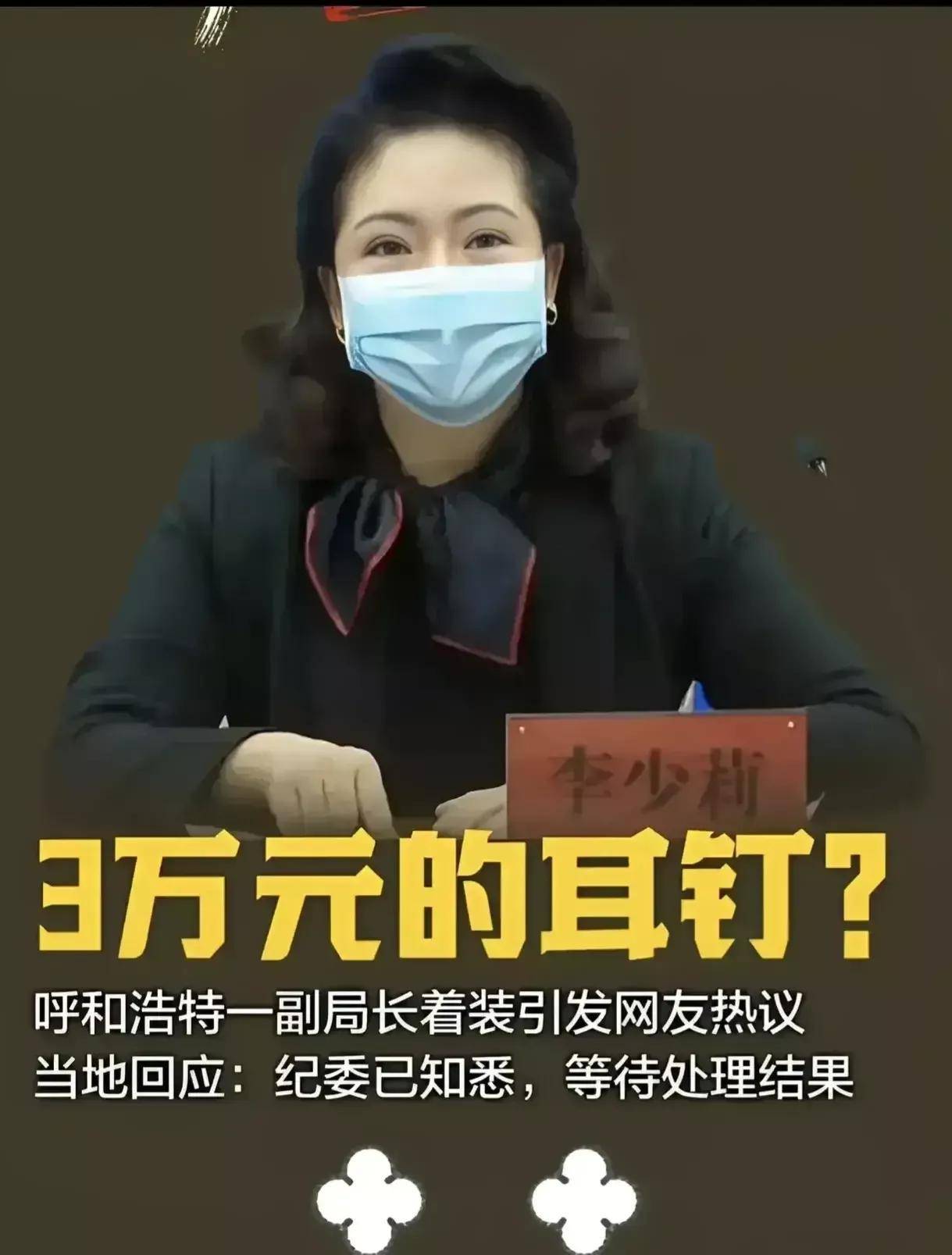 有网友说:“都把时间和肉体花在扮自己的身上,怎样还有时间去进步自己的工作才干呢?” 李少莉被大家所诟,大致分为两个方面: 一个方面是李少莉新闻发布会上扮得很精致,固然戴着口罩,但也能看得出来,李少莉是精心肠画过自己的妆容。 发布会上李少莉一头的大波浪卷发,耳朵上戴着一对耳钉脖子围着一条丝巾,远看少莉佩戴的耳饰和丝巾都是朴素品牌,耳钉疑似法国朴素品牌梵克雅宝的,官网税后售价超3万元,丝巾疑似爱马仕的,市场价4000元以上。